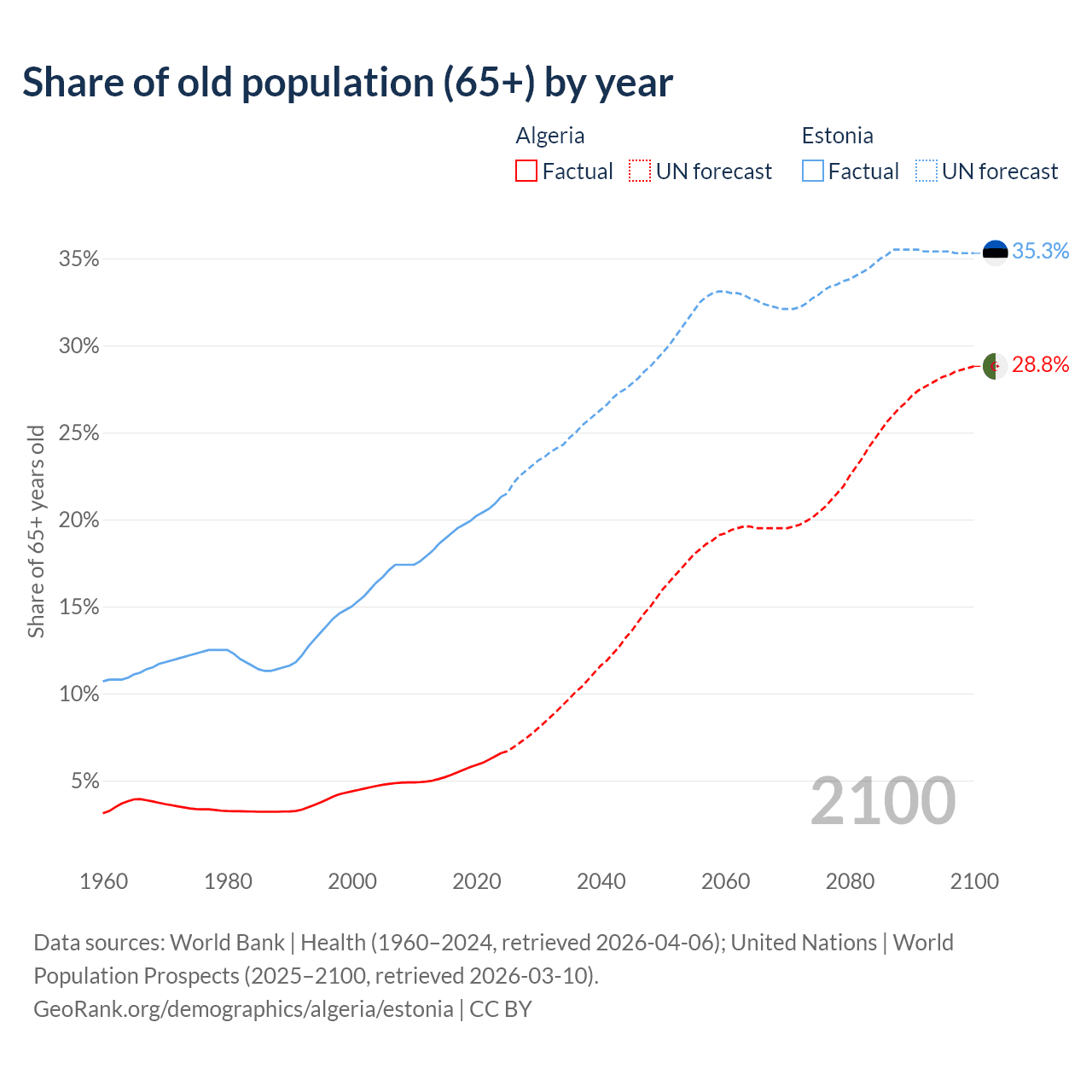 The share of older people aged 65 and over is 6.58% in Algeria and 21.3% in Estonia. Life expectancy in Algeria compared to Estonia .