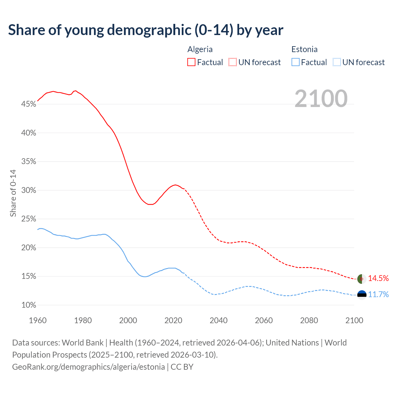 - The share of young demographic (0-15 years old) in Algeria is 30.3% vs 15.6% in Estonia.