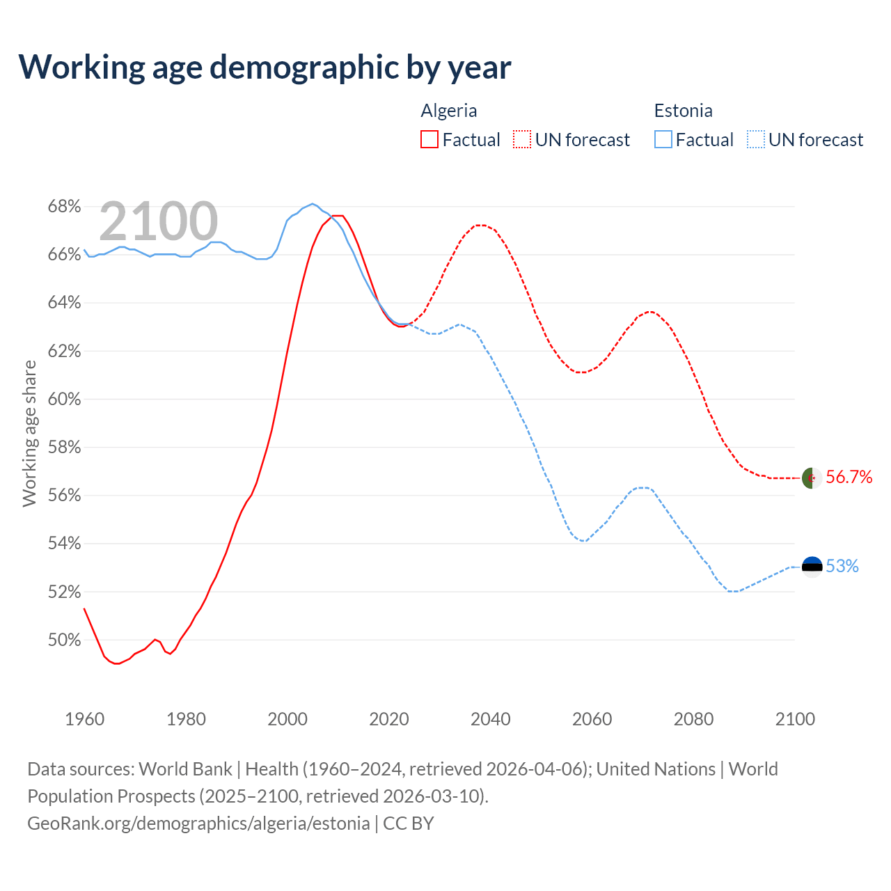 Median age Algeria vs Estonia, 1960-2100