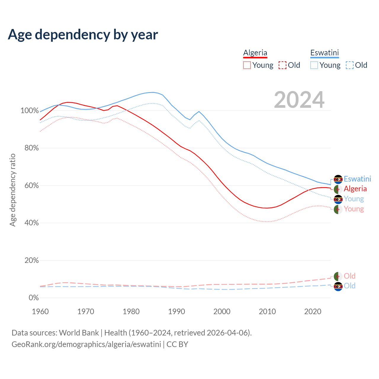 - The share of old-age demographic (65+) in Algeria is 6.58% vs 4.26% in Eswatini.