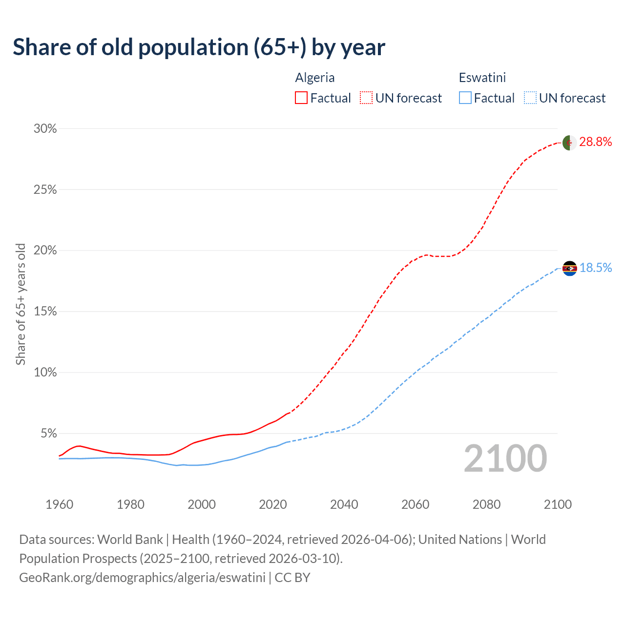 The share of older people aged 65 and over is 6.58% in Algeria and 4.26% in Eswatini. Life expectancy in Algeria compared to Eswatini .