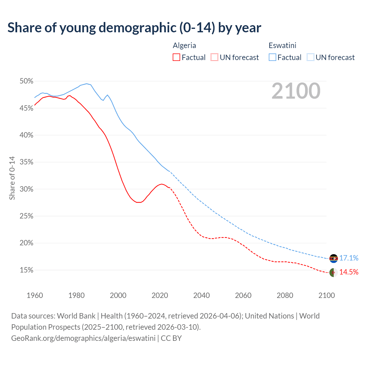 - The share of young demographic (0-15 years old) in Algeria is 30.3% vs 33.4% in Eswatini.