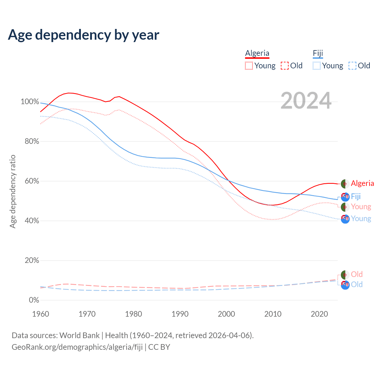 - The share of old-age demographic (65+) in Algeria is 6.58% vs 6.49% in Fiji.