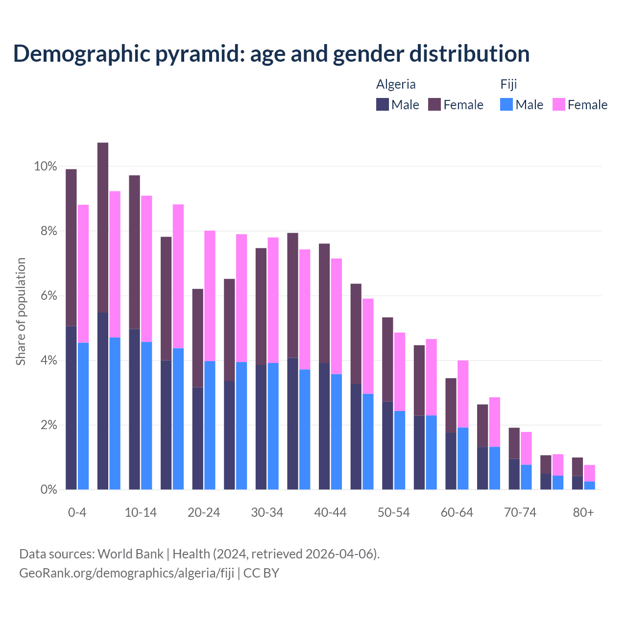 - Algeria is ranked 111/196 by median age (oldest to youngest) vs 113/196 for Fiji.