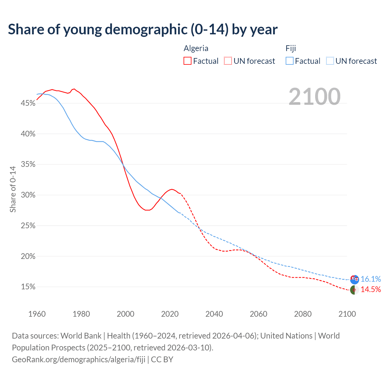 - The share of young demographic (0-15 years old) in Algeria is 30.3% vs 27.1% in Fiji.