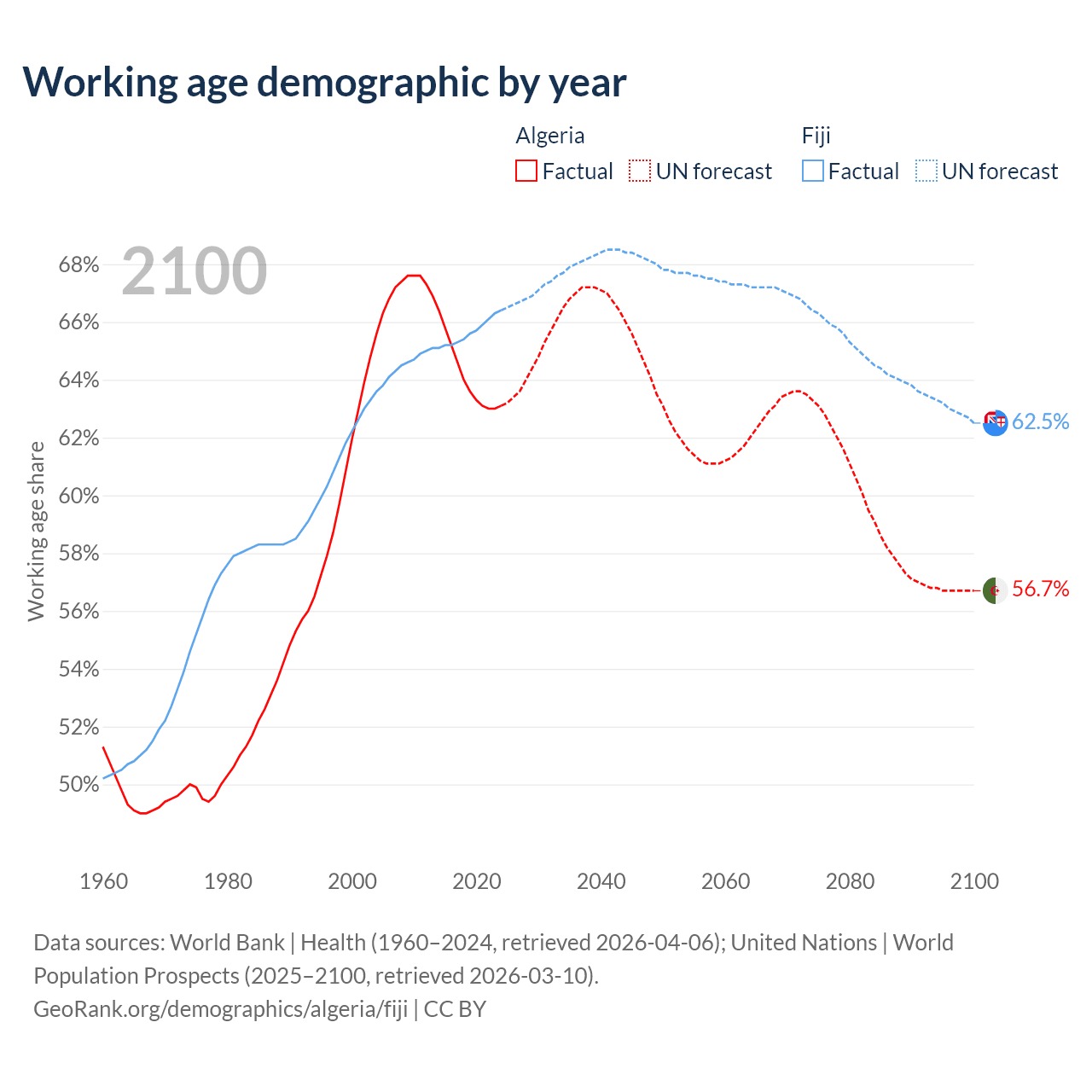 - Algeria has 30.4M working age adults (aged 15-64) vs 623K in Fiji.