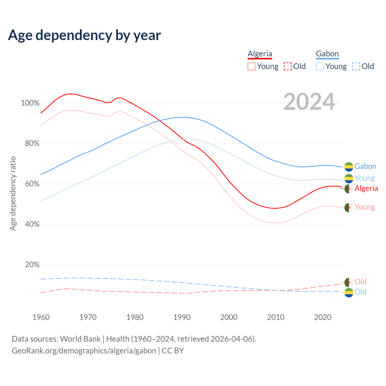 - The share of old-age demographic (65+) in Algeria is 6.58% vs 4.08% in Gabon.