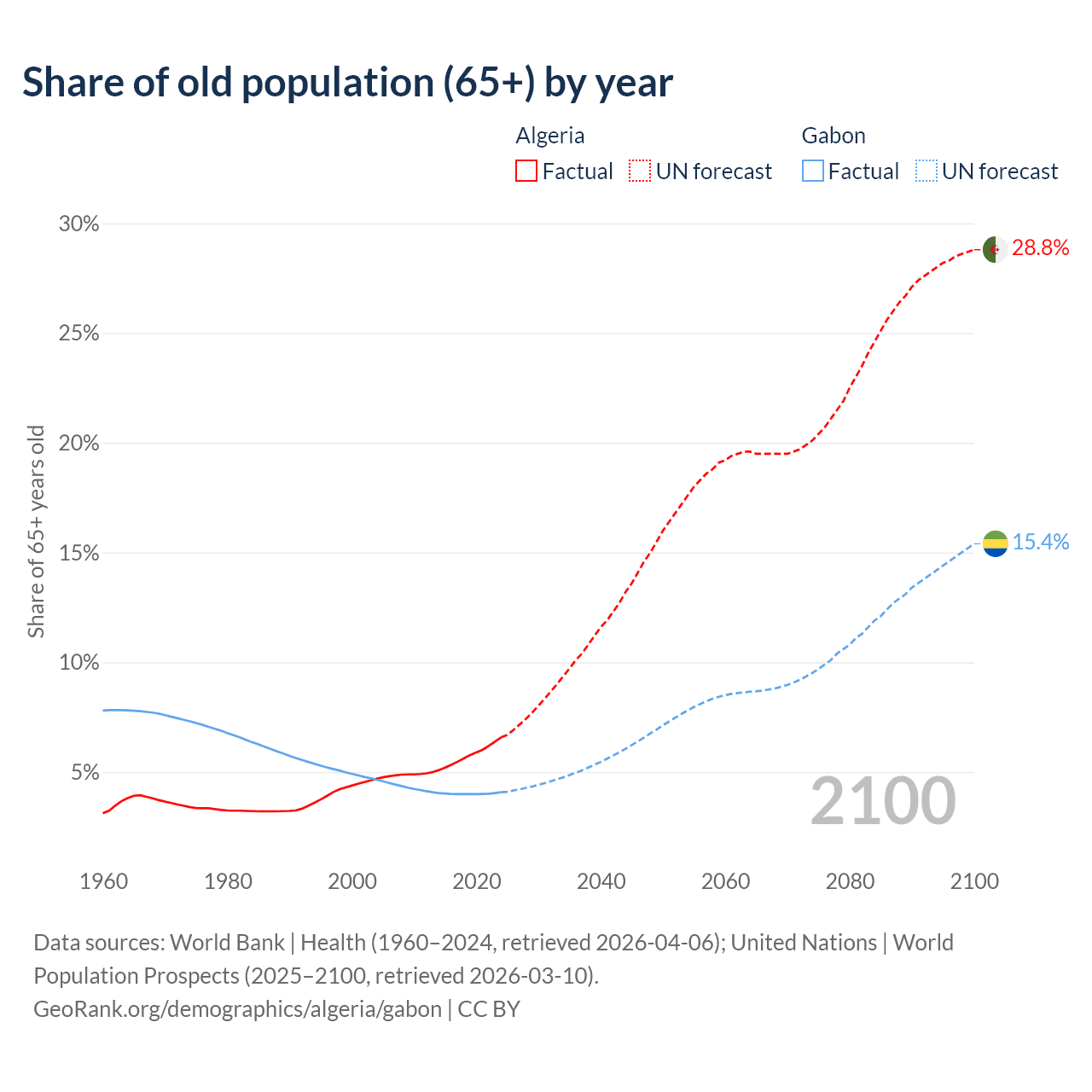 The share of older people aged 65 and over is 6.58% in Algeria and 4.08% in Gabon. Life expectancy in Algeria compared to Gabon .