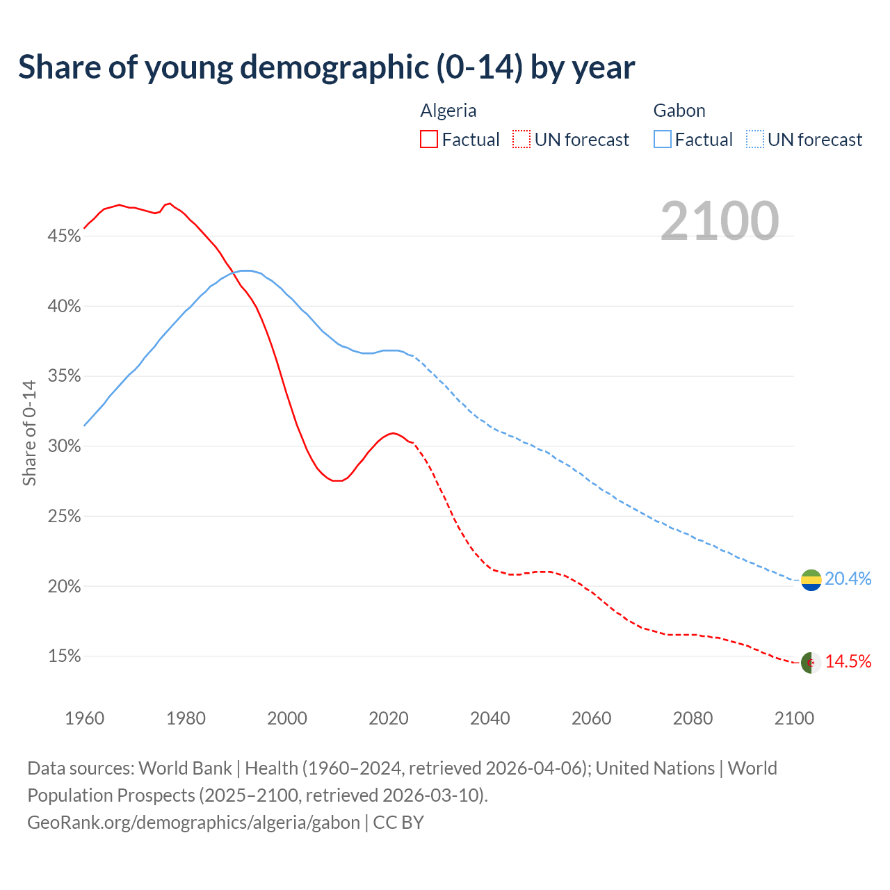 - The share of young demographic (0-15 years old) in Algeria is 30.3% vs 36.5% in Gabon.
