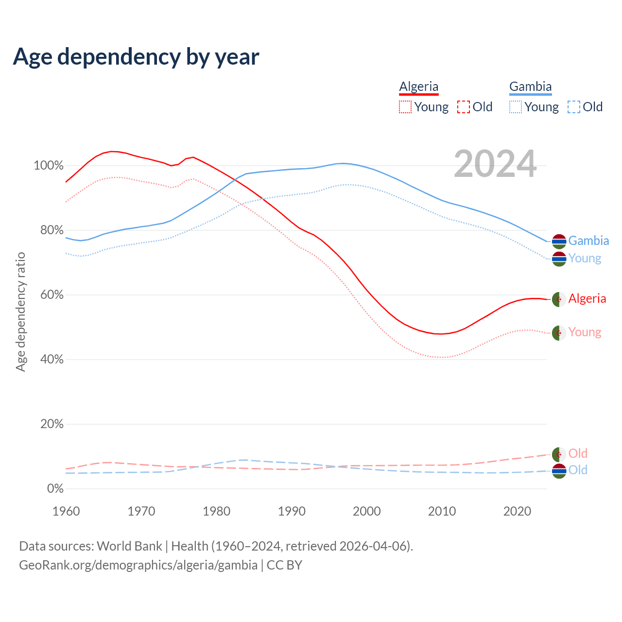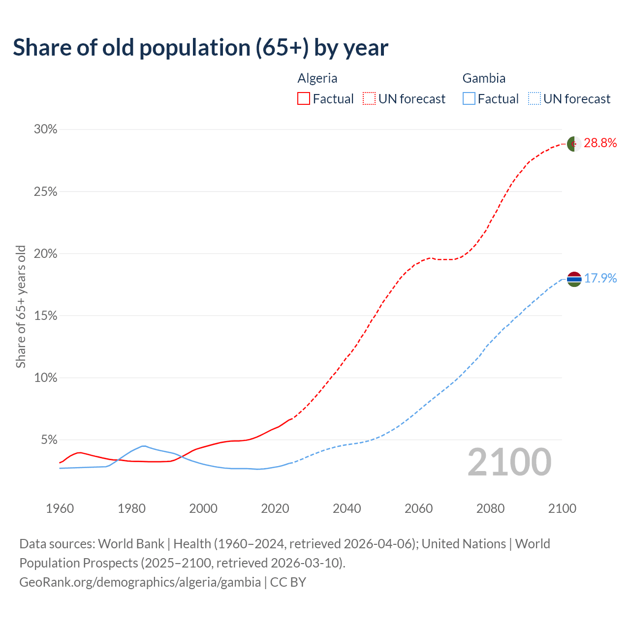 - The share of old-age demographic (65+) in Algeria is 6.58% vs 3.08% in the Gambia.