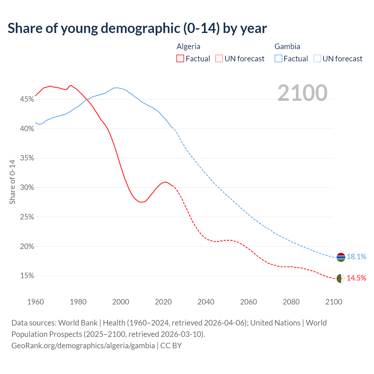 - The share of young demographic (0-15 years old) in Algeria is 30.3% vs 40.2% in the Gambia.