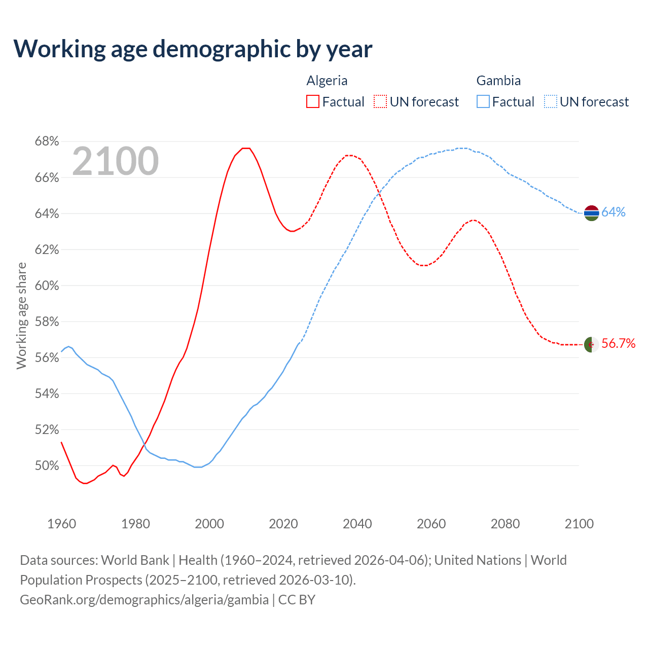 - Algeria has 30.4M working age adults (aged 15-64) vs 1.64M in the Gambia.