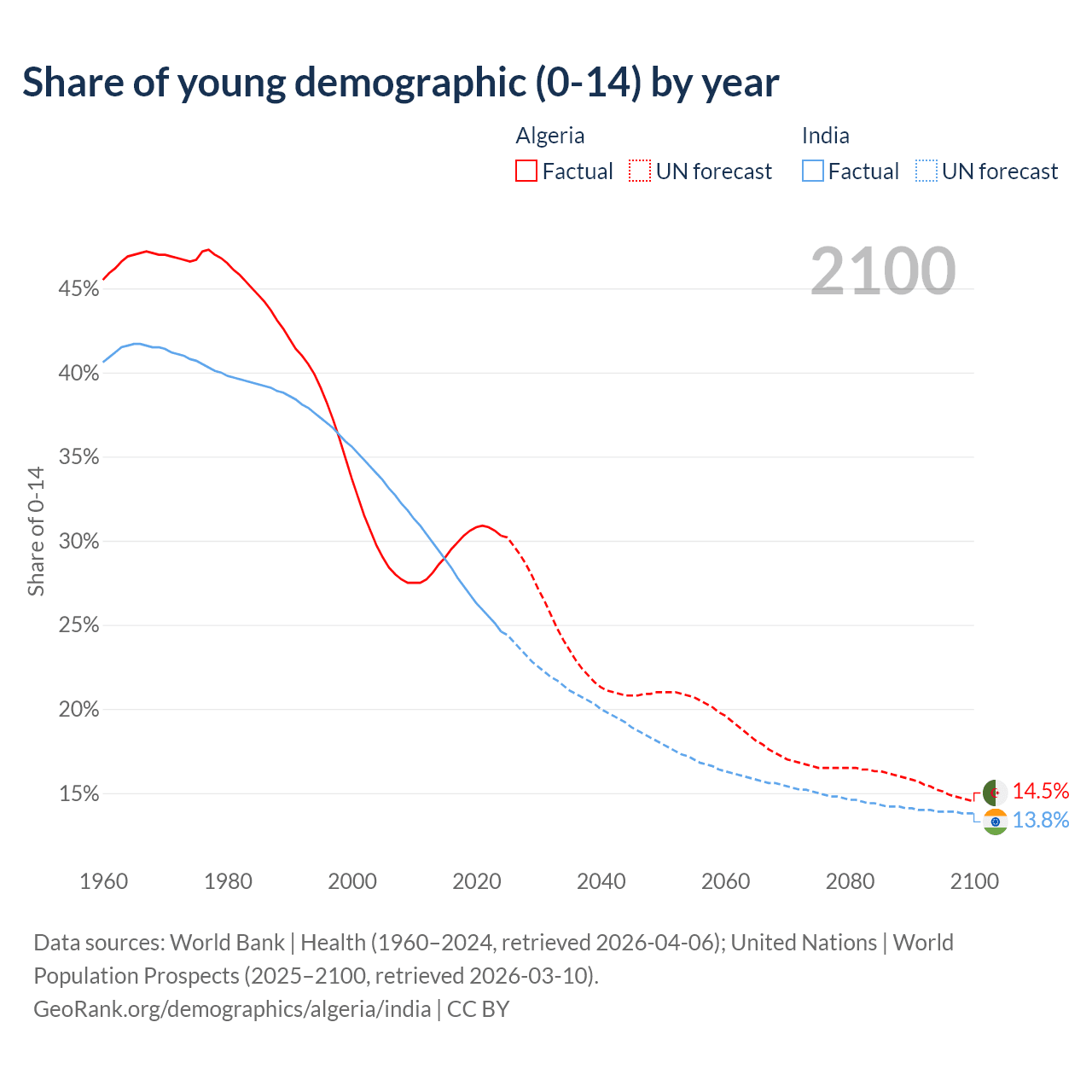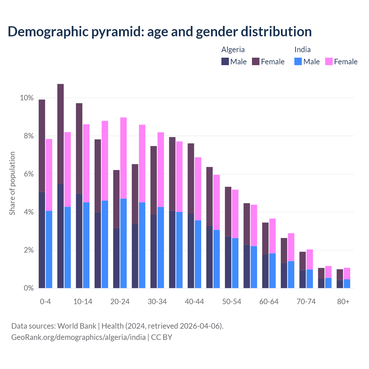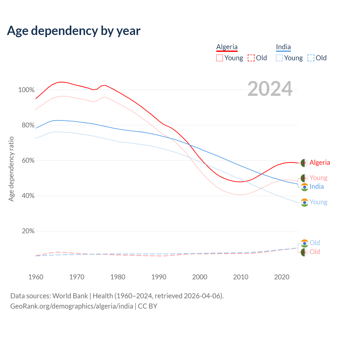 - Algeria is ranked 111/196 by median age (oldest to youngest) vs 108/196 for India.