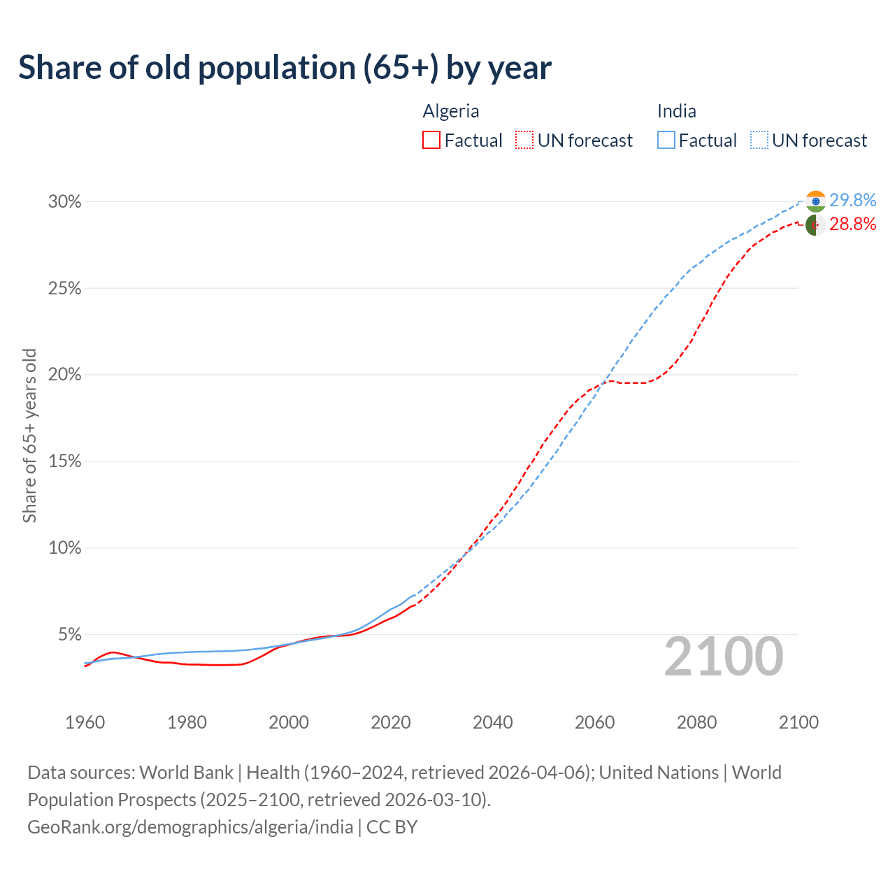 - The share of old-age demographic (65+) in Algeria is 6.58% vs 7.15% in India.