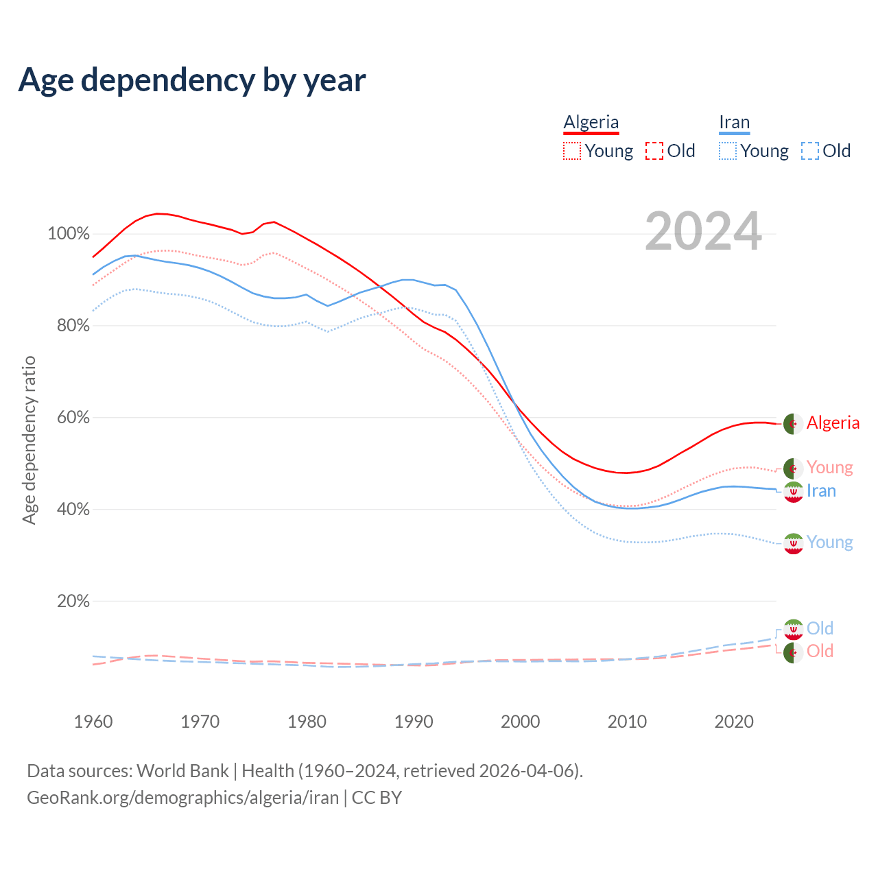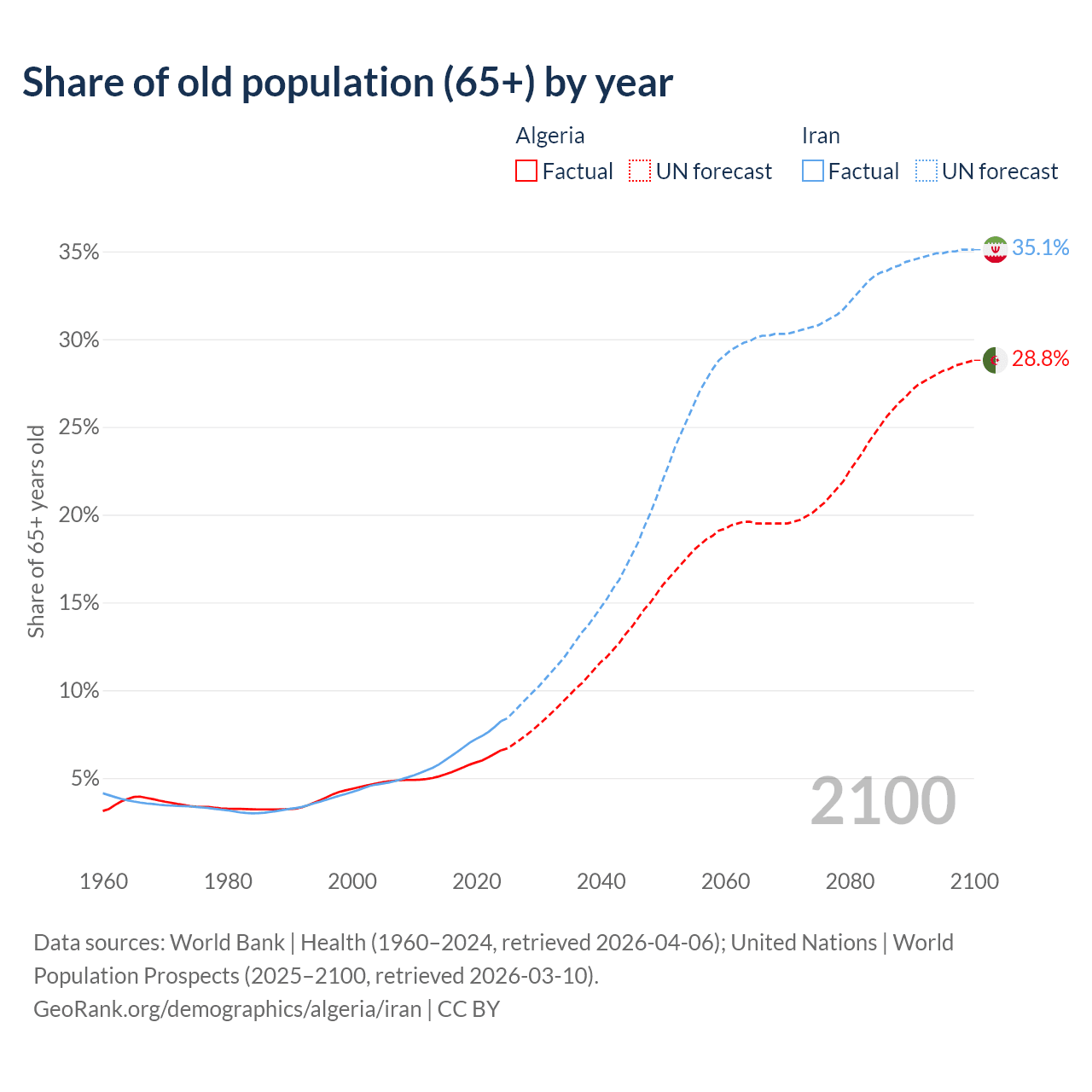 - The share of old-age demographic (65+) in Algeria is 6.58% vs 8.24% in Iran.