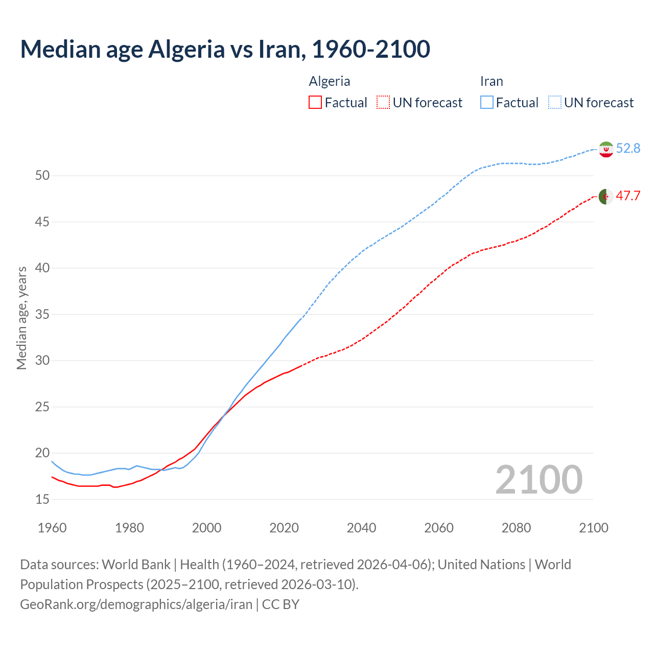 Median age Algeria vs Iran, 1960-2100