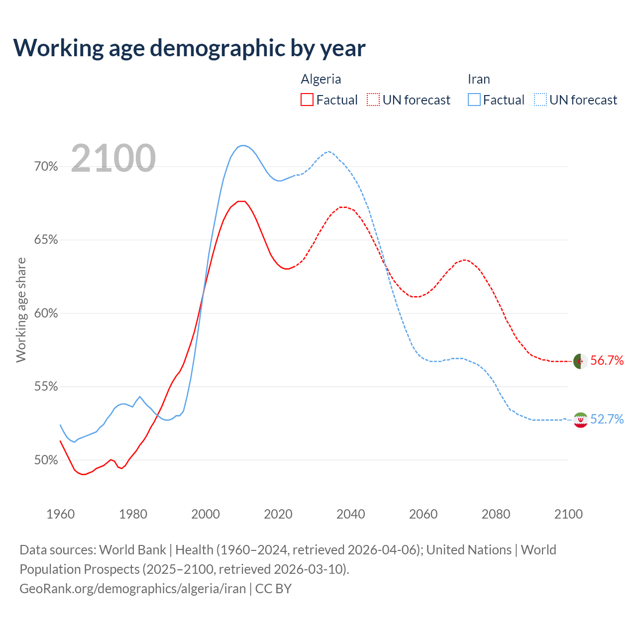 - Algeria has 30.4M working age adults (aged 15-64) vs 64.8M in Iran.