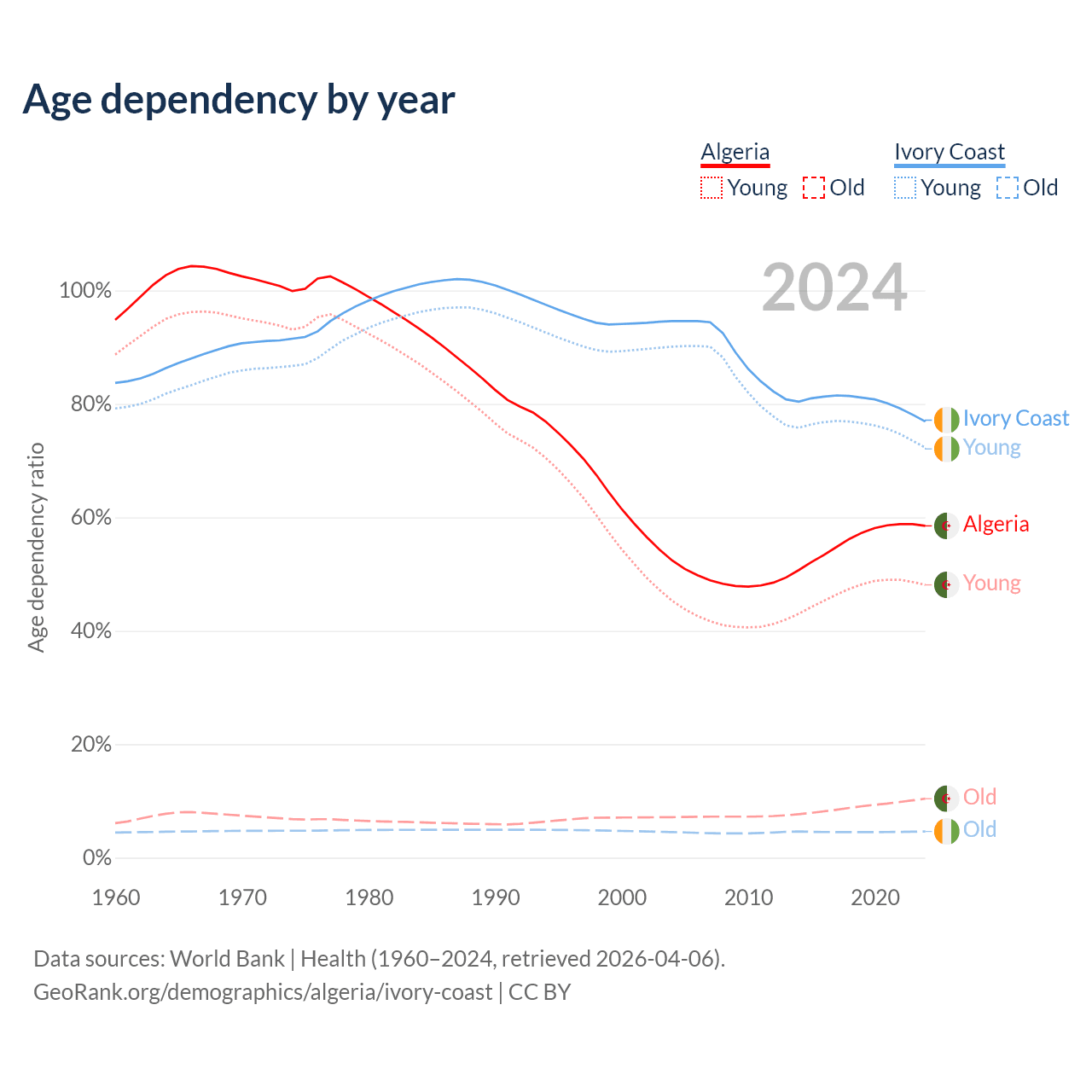 - Algeria is ranked 111/196 by median age (oldest to youngest) vs 175/196 for Ivory Coast.