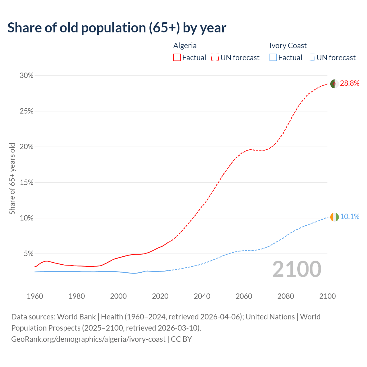 - The share of old-age demographic (65+) in Algeria is 6.58% vs 2.61% in Ivory Coast.