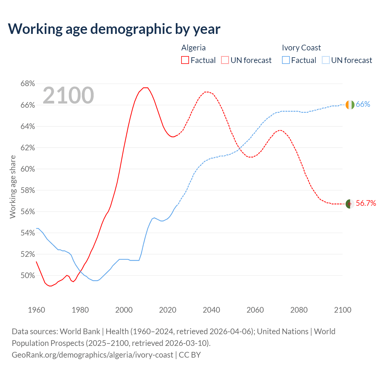 - Algeria has 30.4M working age adults (aged 15-64) vs 19.1M in Ivory Coast.