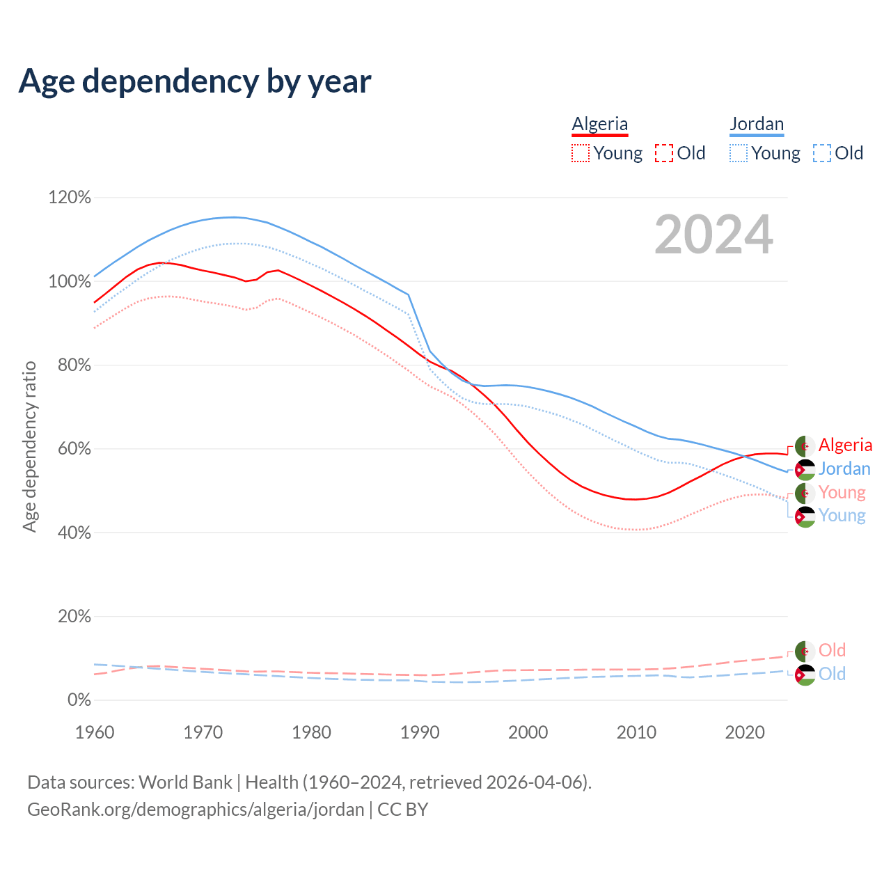 Data sources: World Bank | Health (1960–2024, retrieved 2026-04-06); U.S. Census Bureau (1960–2024, retrieved 2026-02-08).
