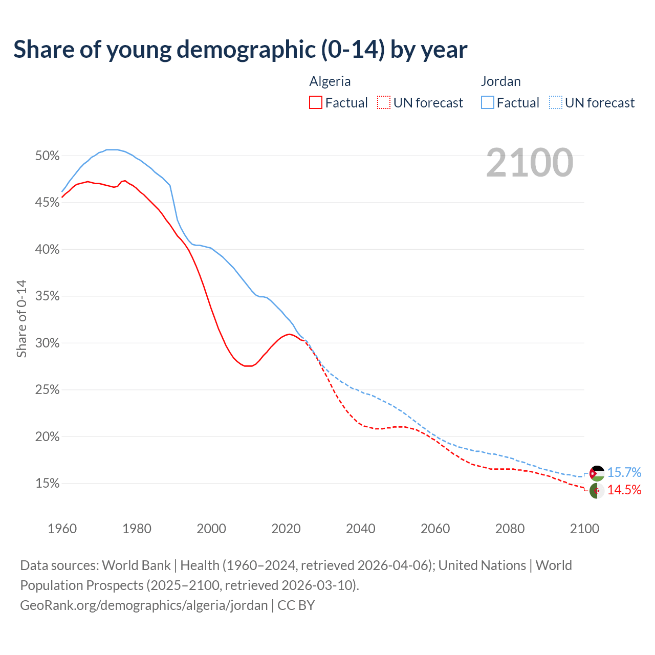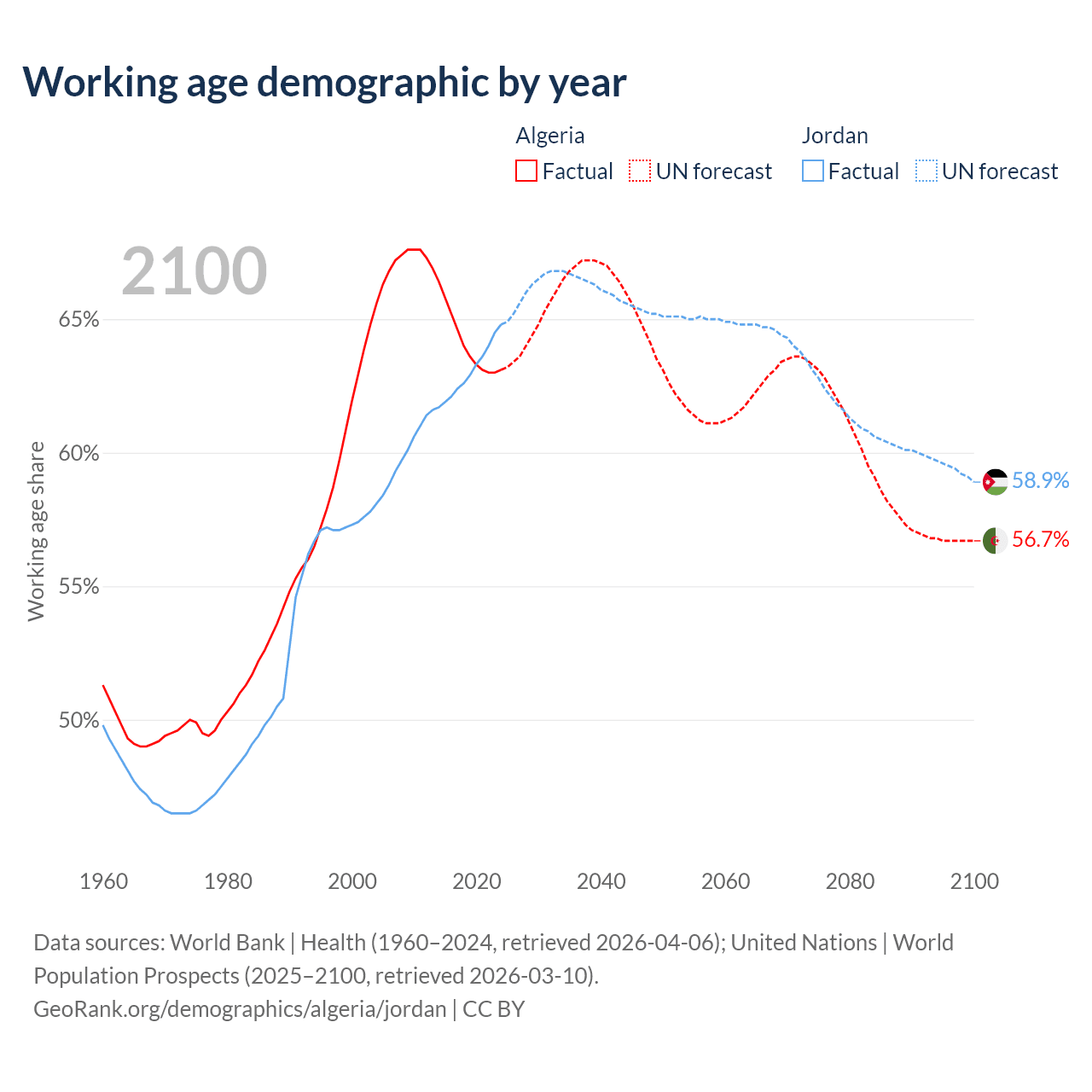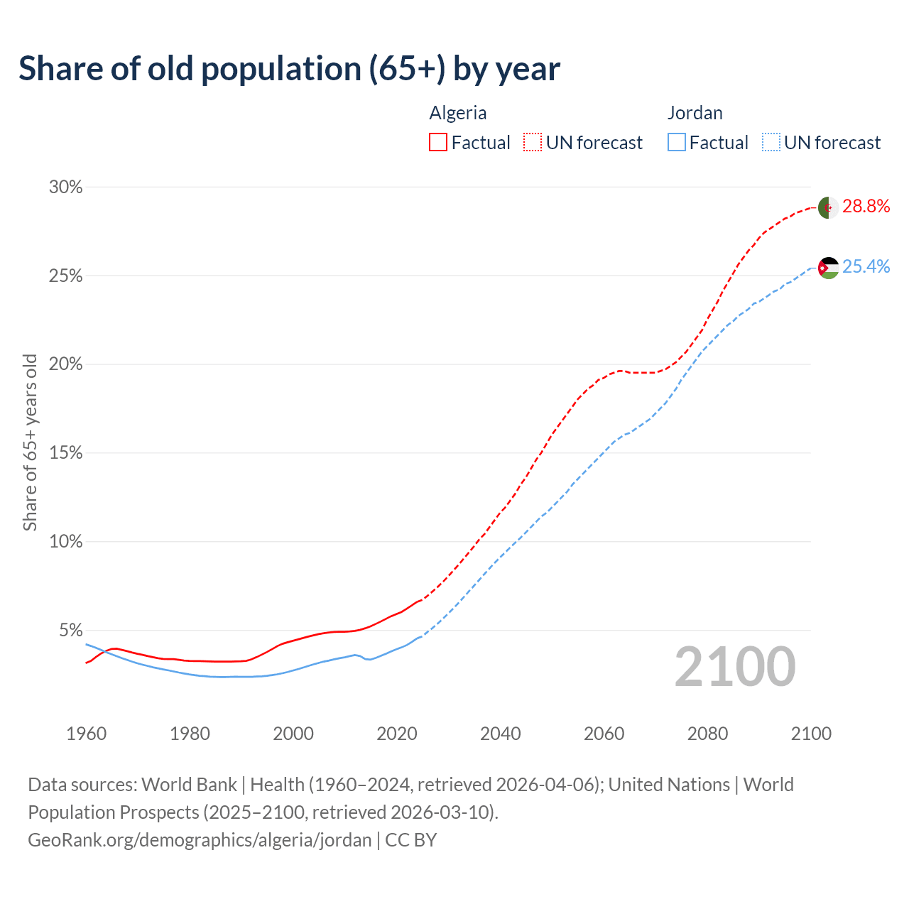 Median age Algeria vs Jordan, 1960-2100