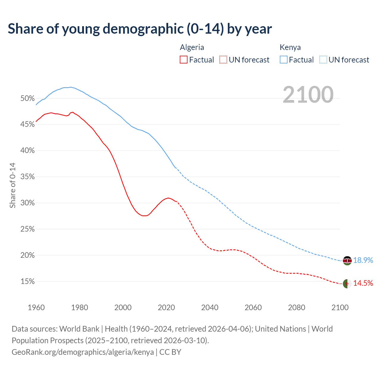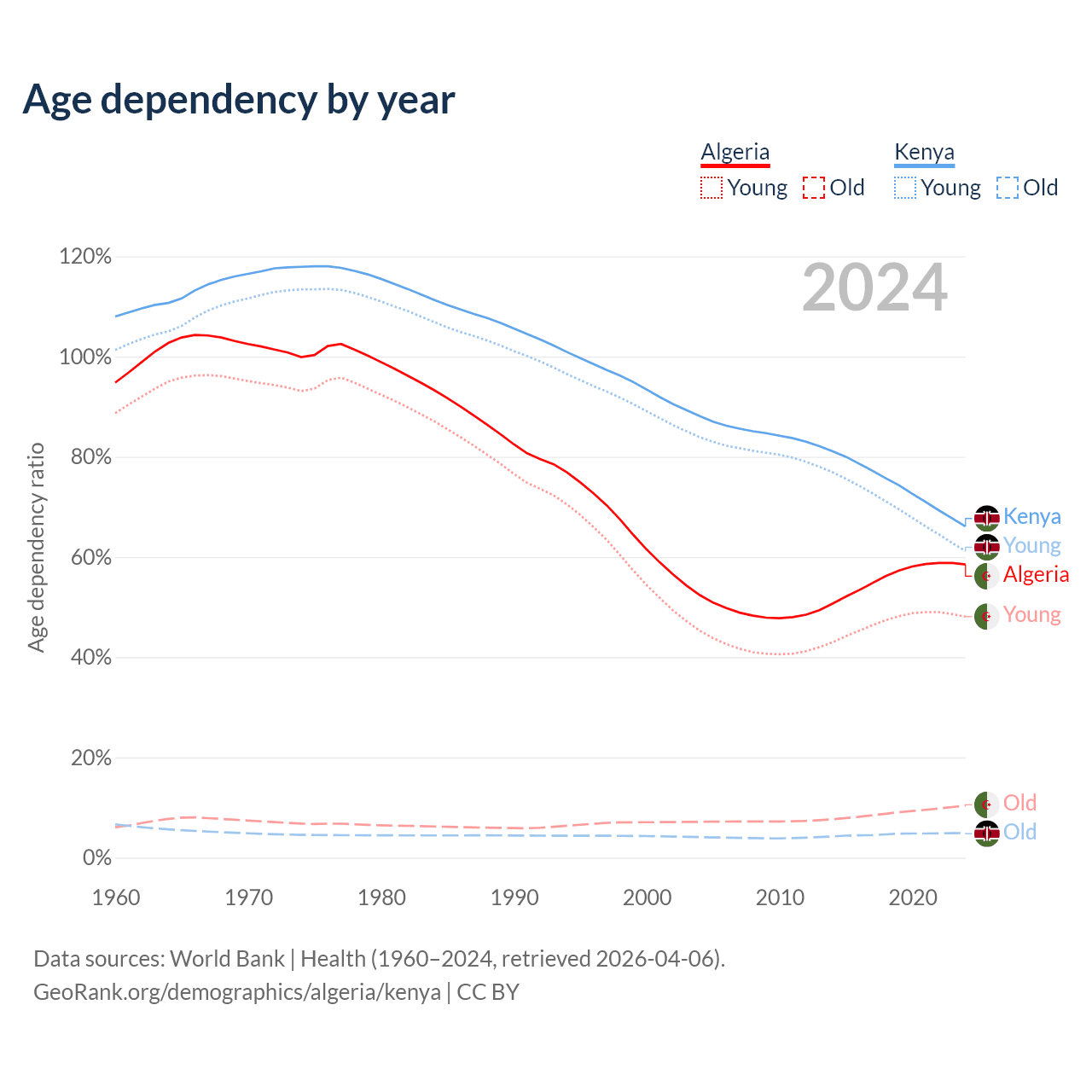 - Algeria is ranked 111/196 by median age (oldest to youngest) vs 159/196 for Kenya.