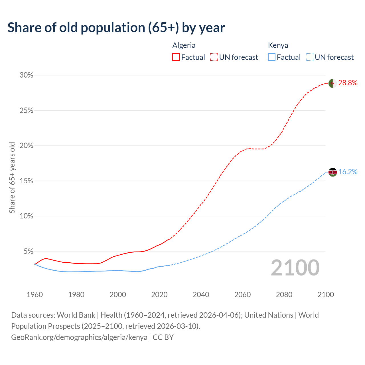 The share of older people aged 65 and over is 6.58% in Algeria and 2.97% in Kenya. Life expectancy in Algeria compared to Kenya .