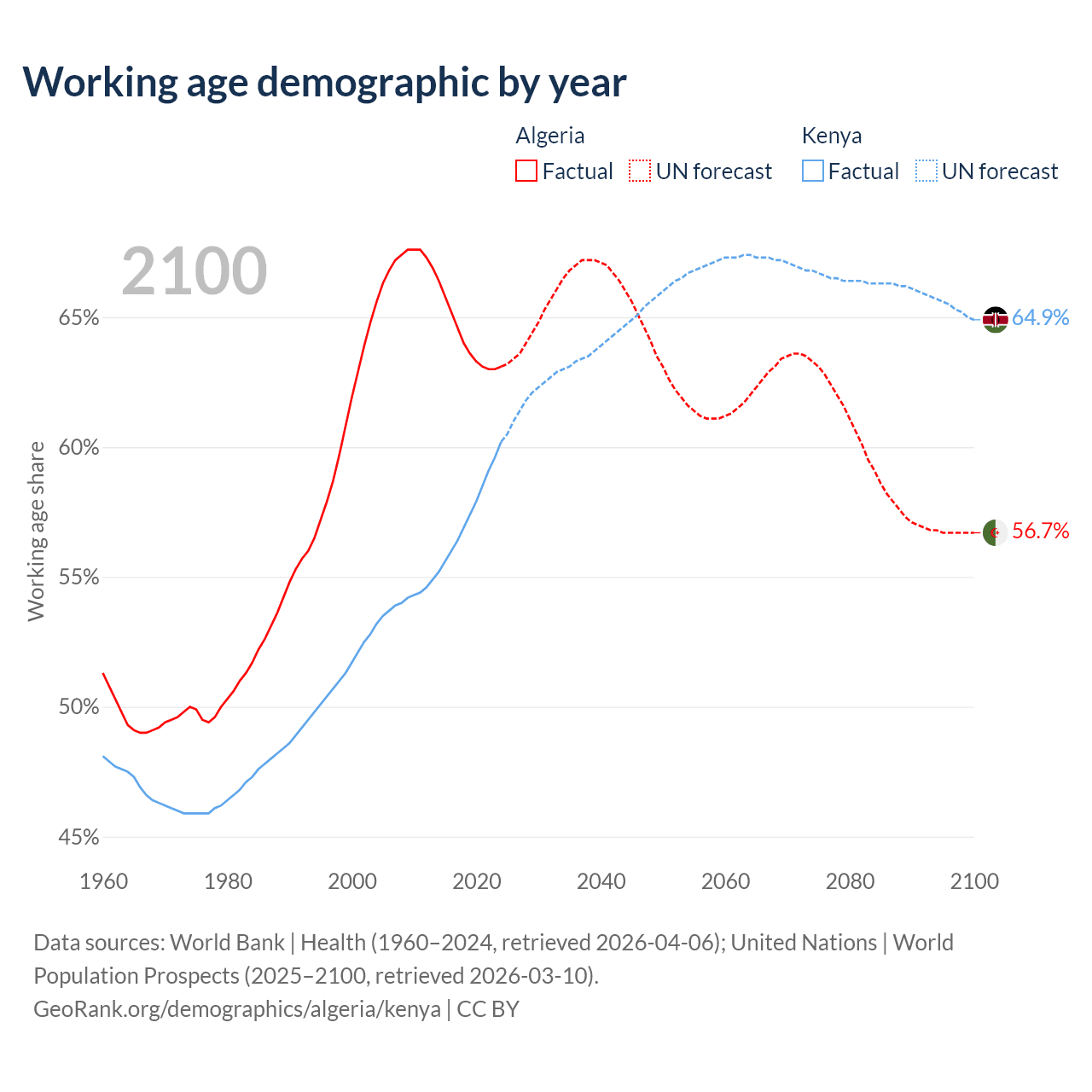 - Algeria has 30.4M working age adults (aged 15-64) vs 35.5M in Kenya.