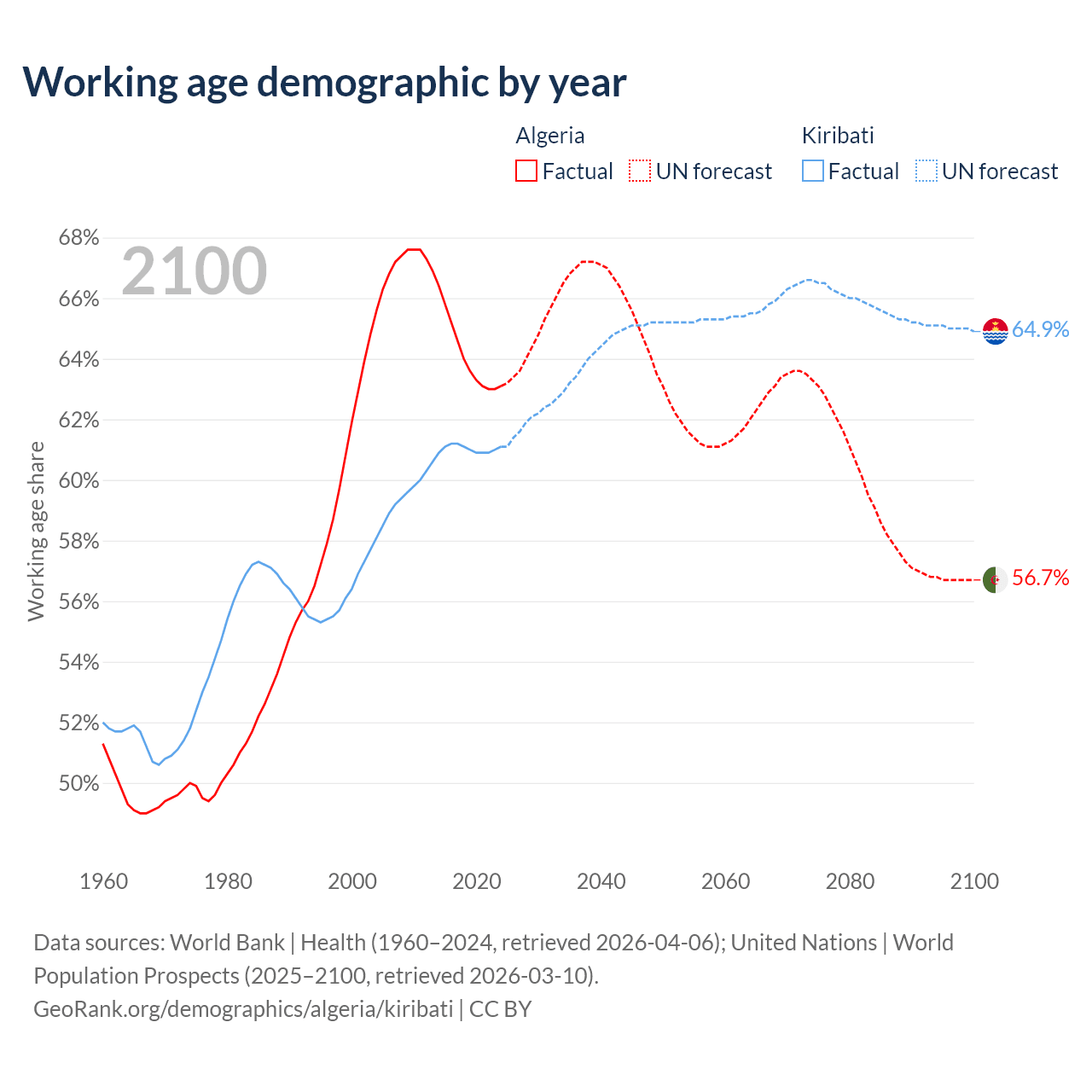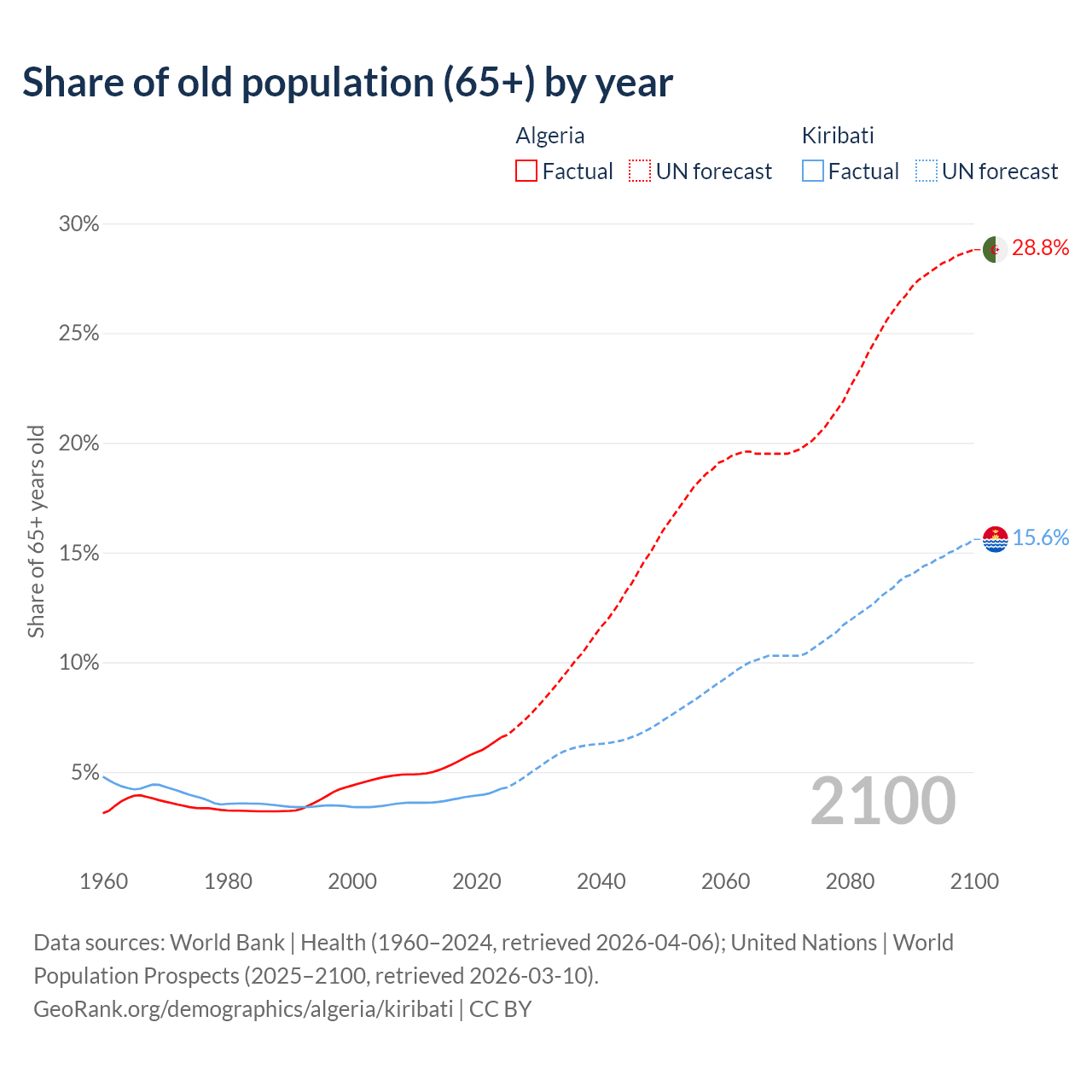 - The share of old-age demographic (65+) in Algeria is 6.58% vs 4.24% in Kiribati.