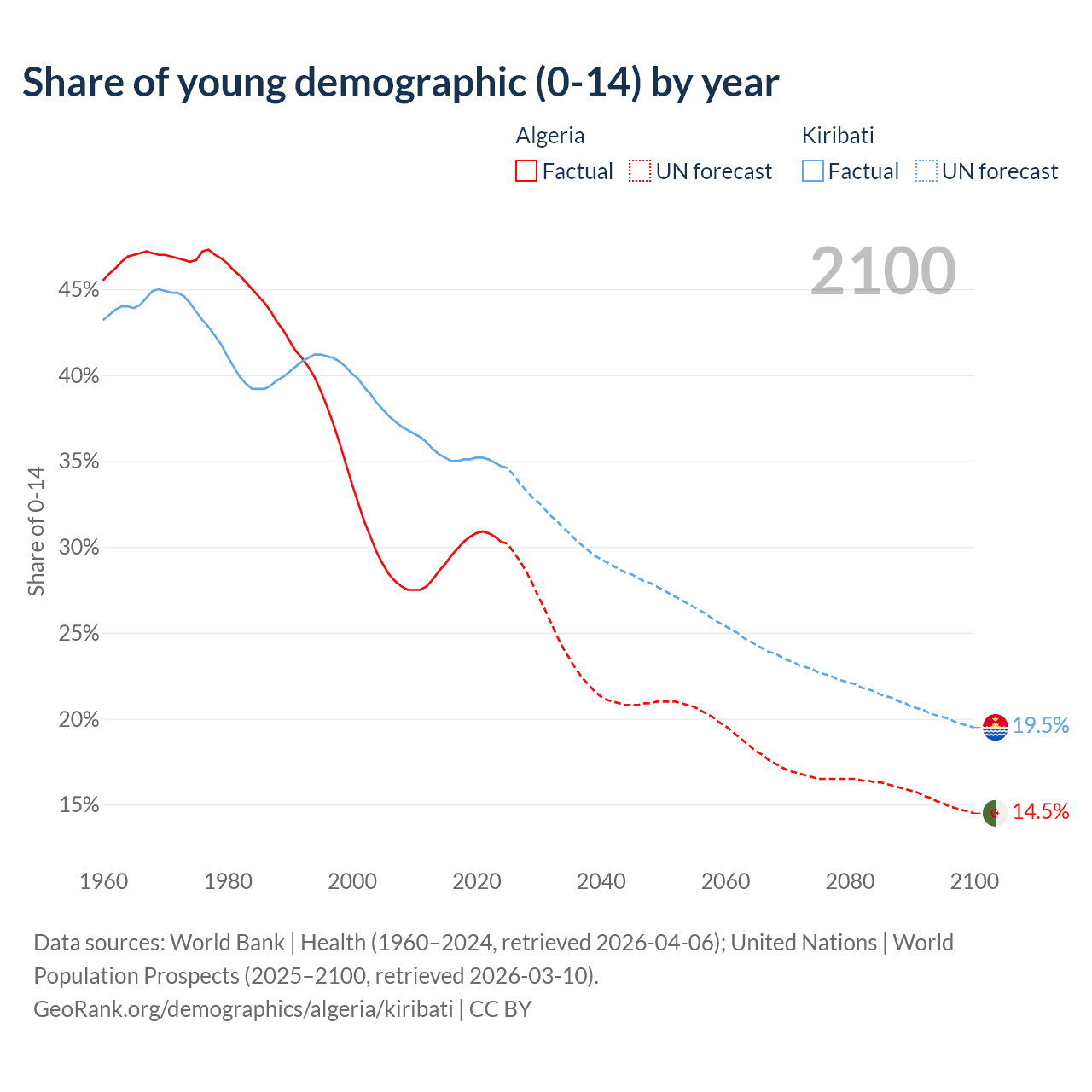 - The share of young demographic (0-15 years old) in Algeria is 30.3% vs 34.7% in Kiribati.