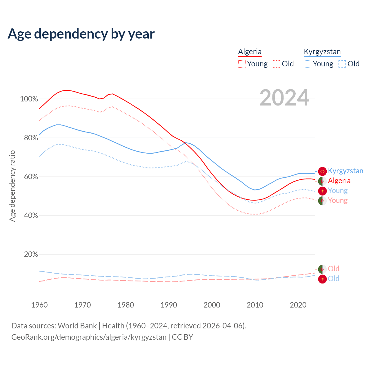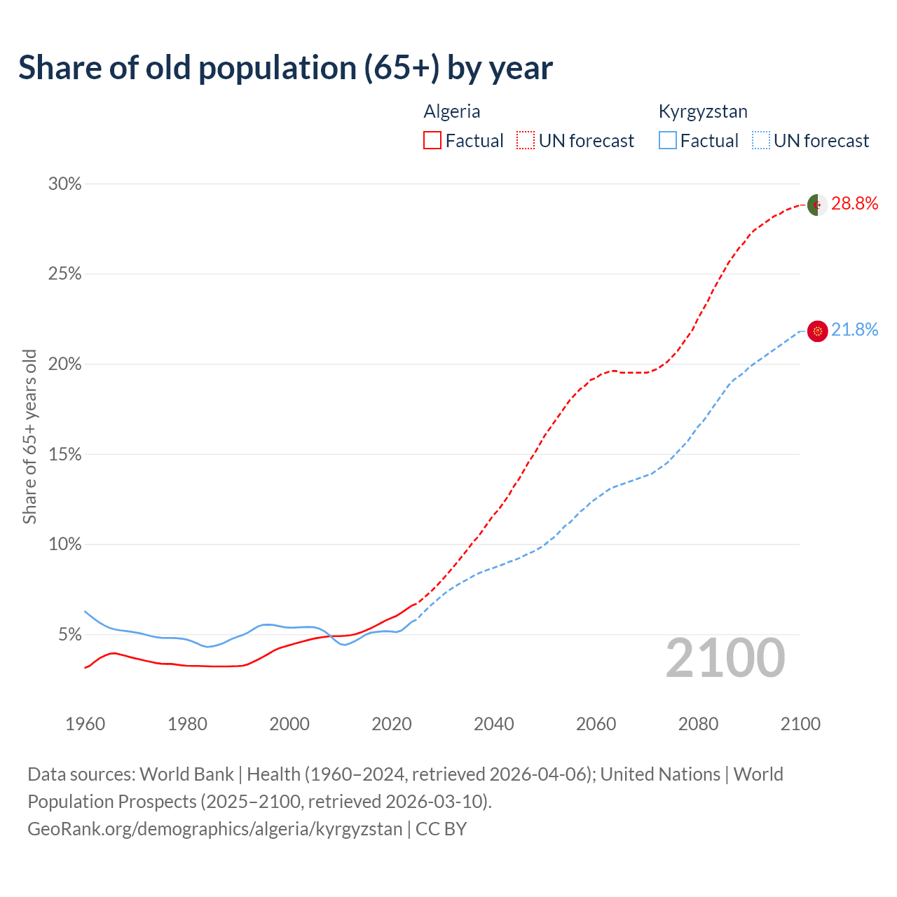 - The share of old-age demographic (65+) in Algeria is 6.58% vs 5.68% in Kyrgyzstan.
