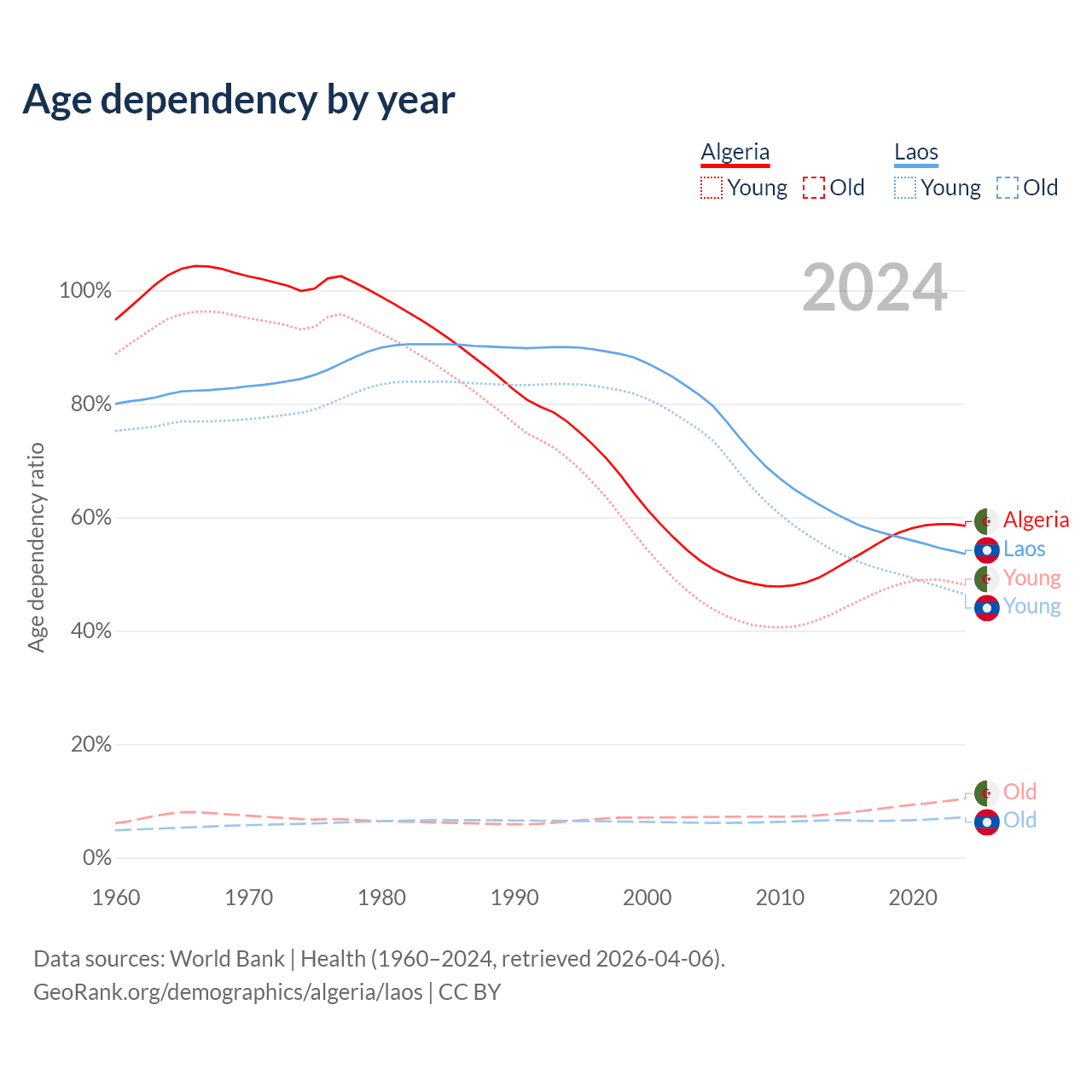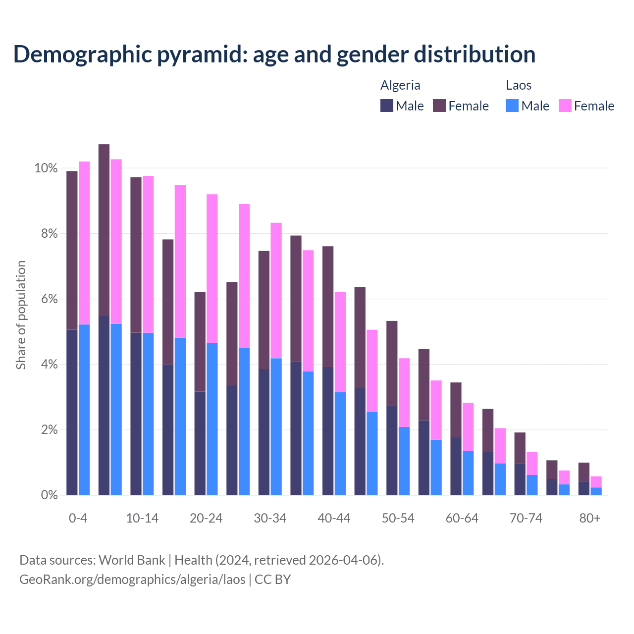- Algeria is ranked 111/196 by median age (oldest to youngest) vs 130/196 for Laos.