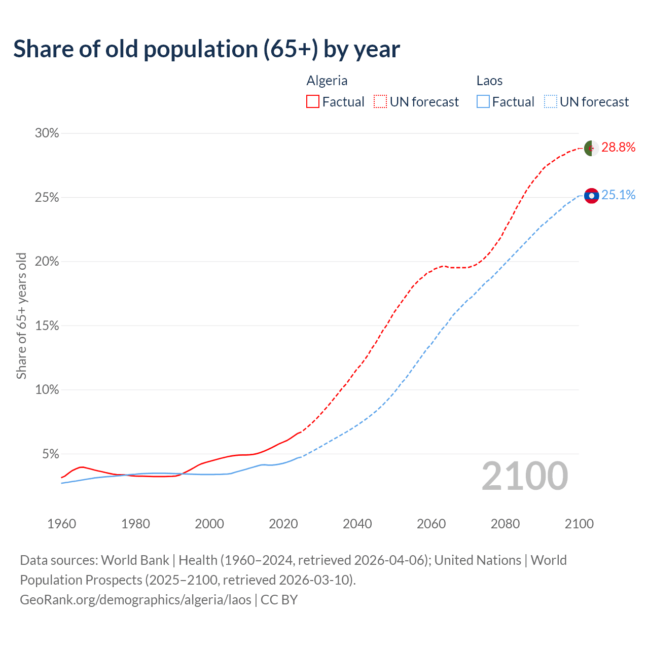 - The share of old-age demographic (65+) in Algeria is 6.58% vs 4.67% in Laos.