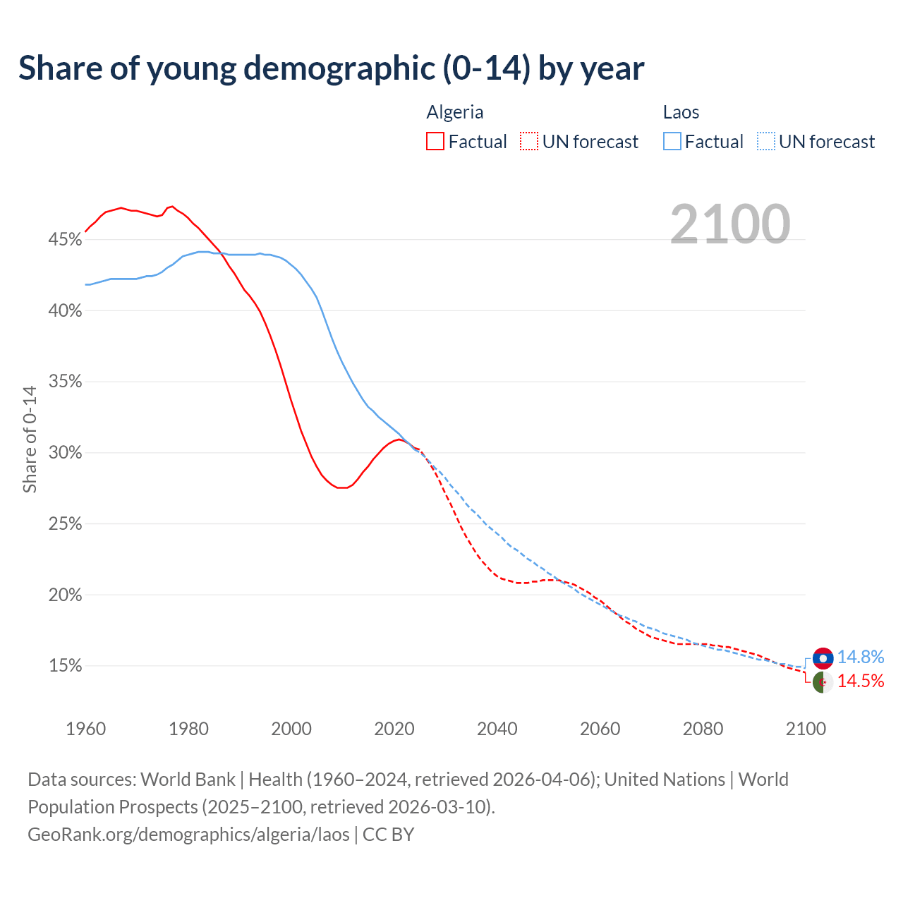 - The share of young demographic (0-15 years old) in Algeria is 30.3% vs 30.2% in Laos.