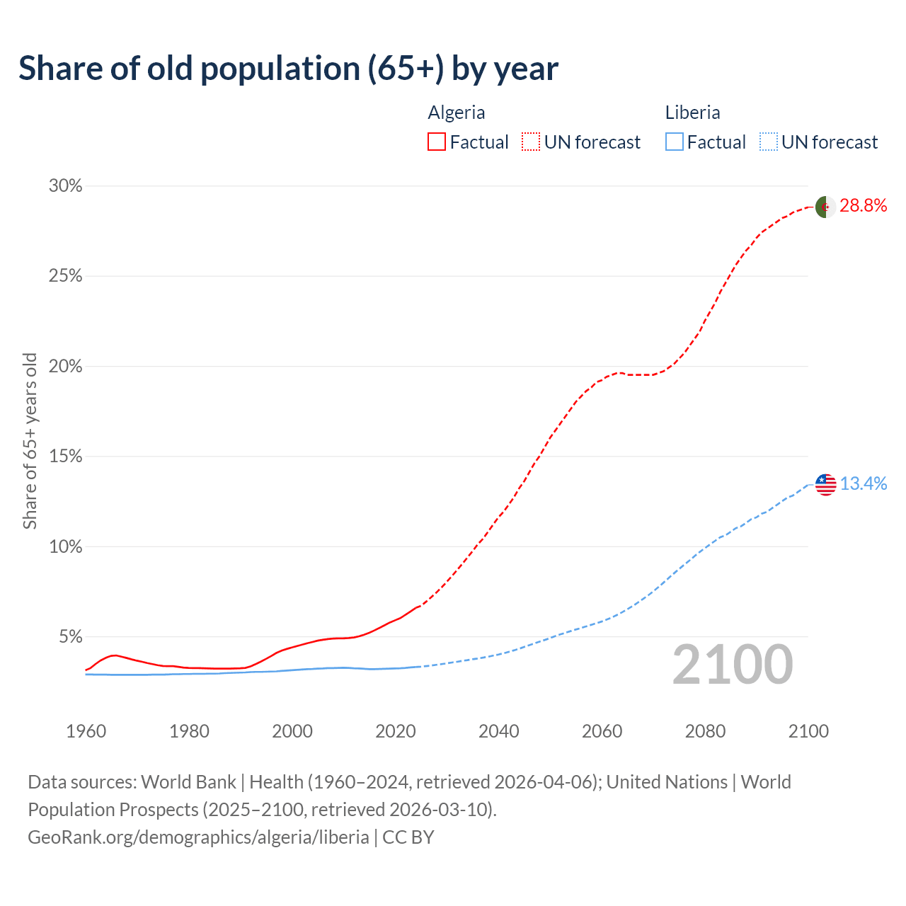 The share of older people aged 65 and over is 6.58% in Algeria and 3.3% in Liberia. Life expectancy in Algeria compared to Liberia .