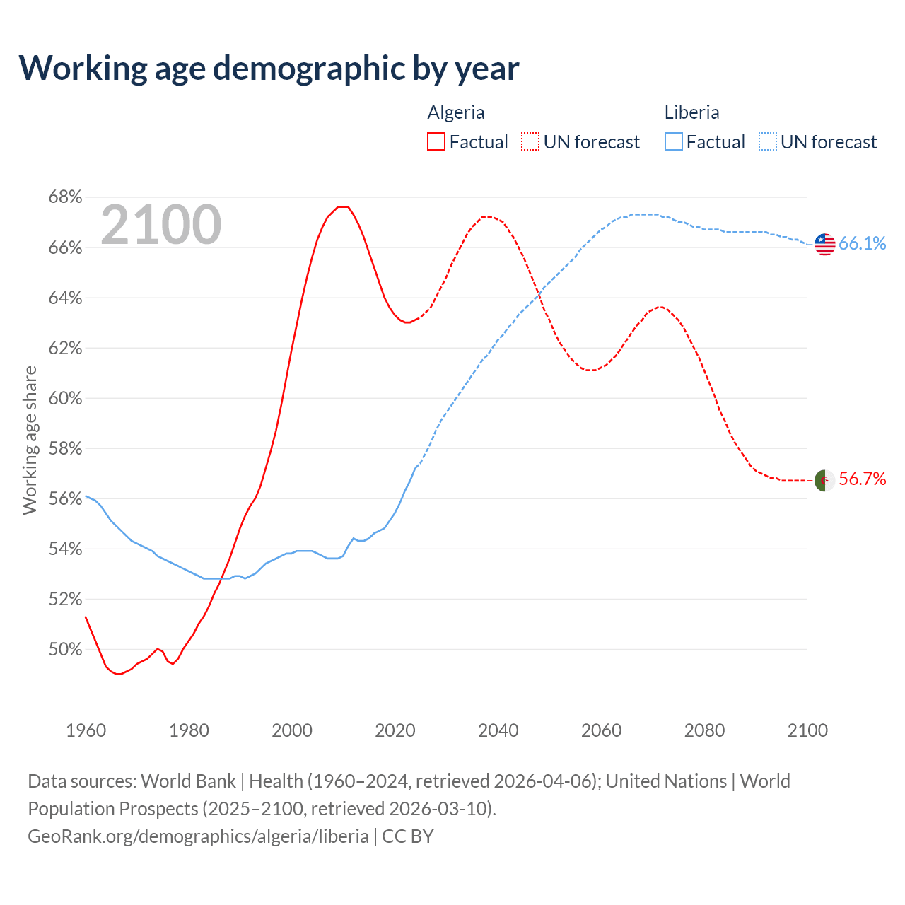 - Algeria has 30.4M working age adults (aged 15-64) vs 3.37M in Liberia.