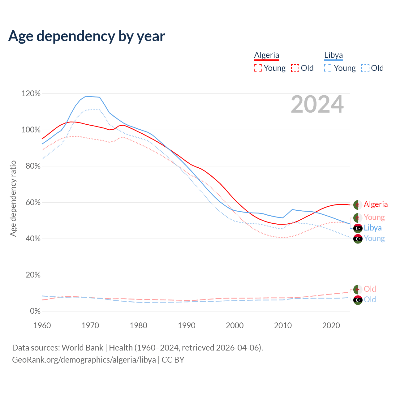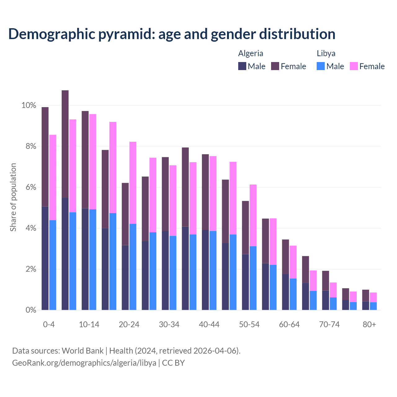 - Algeria is ranked 111/196 by median age (oldest to youngest) vs 114/196 for Libya.