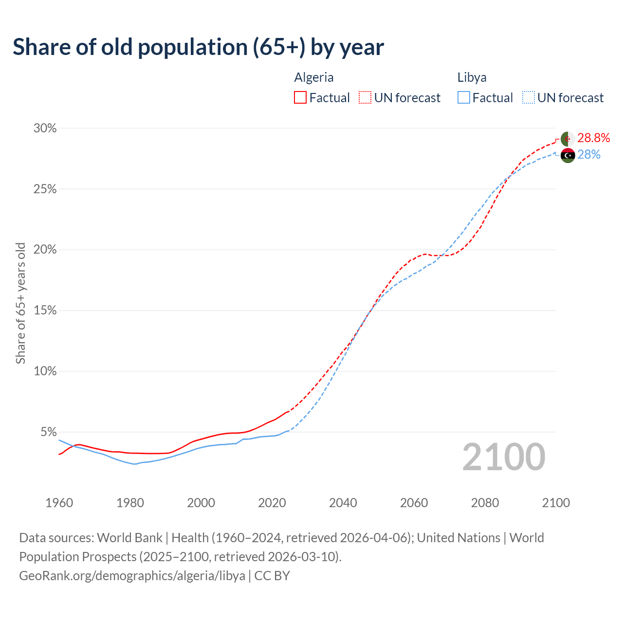 The share of older people aged 65 and over is 6.58% in Algeria and 5.02% in Libya. Life expectancy in Algeria compared to Libya .