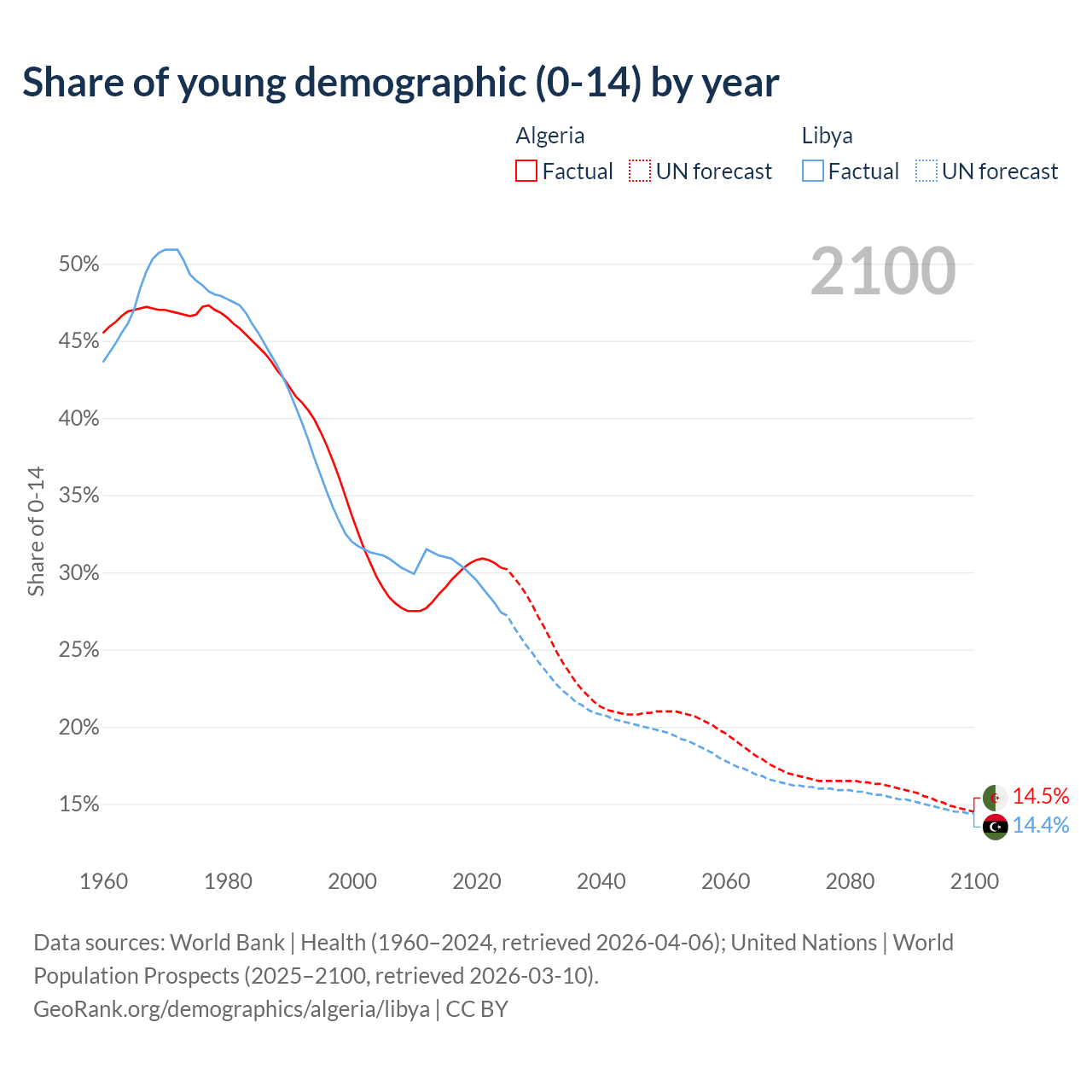 - The share of young demographic (0-15 years old) in Algeria is 30.3% vs 27.4% in Libya.