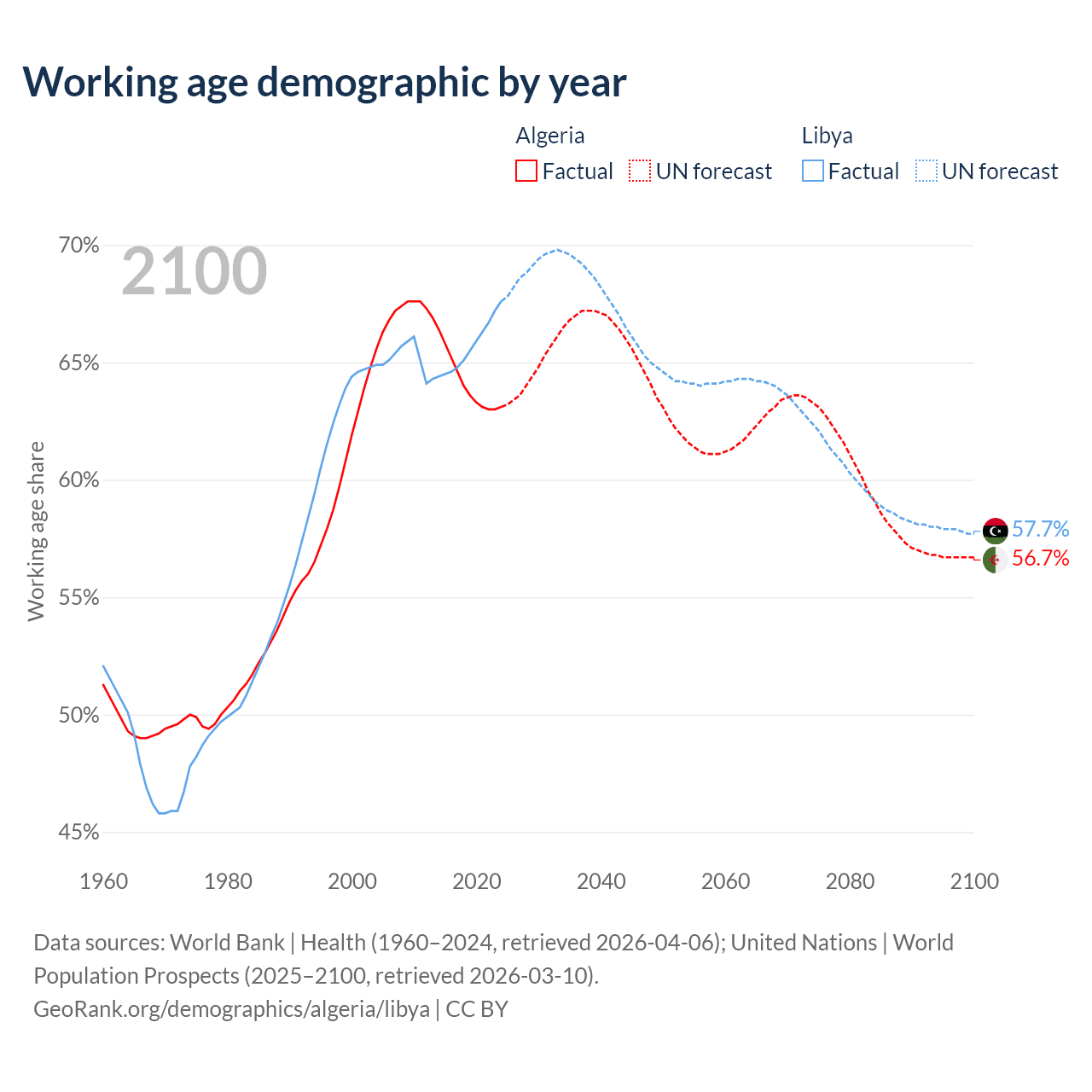 - Algeria has 30.4M working age adults (aged 15-64) vs 5.11M in Libya.