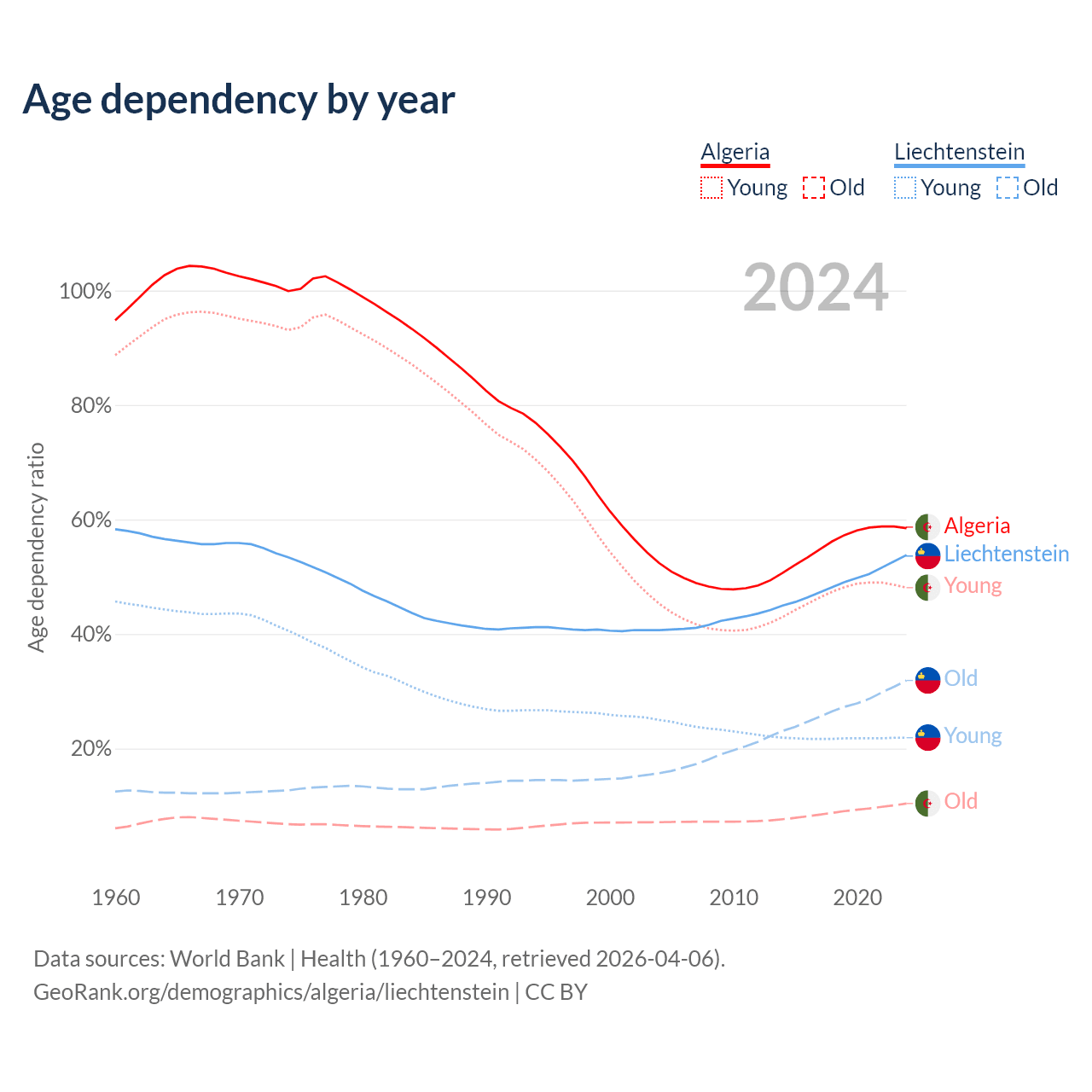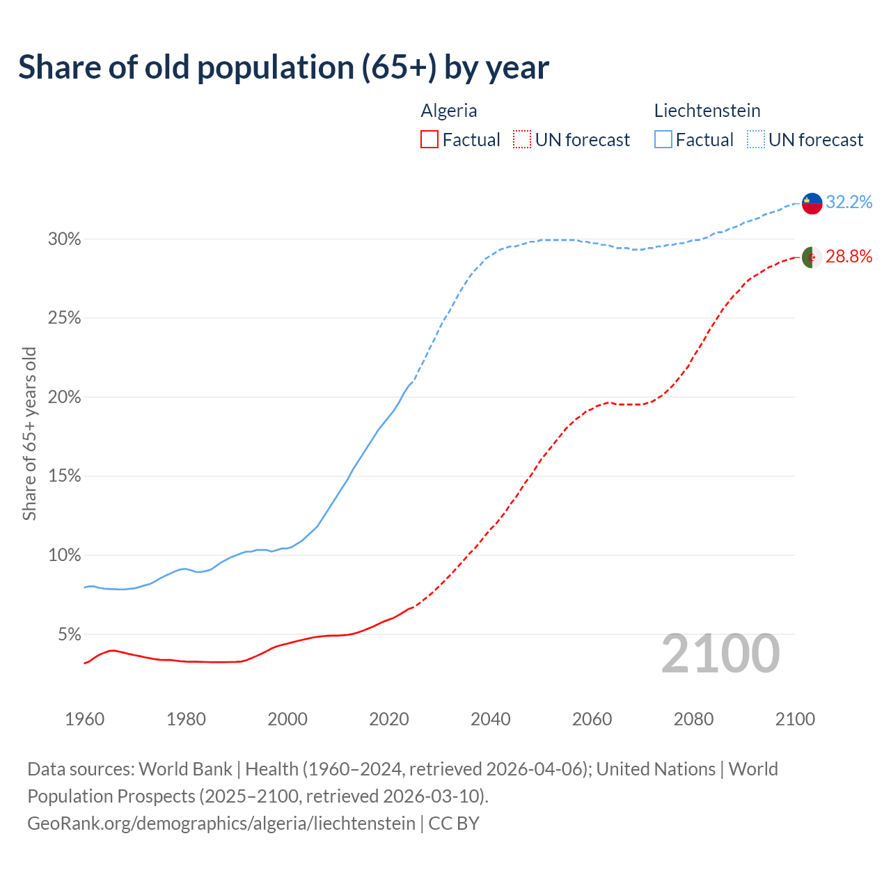 - The share of old-age demographic (65+) in Algeria is 6.58% vs 20.7% in Liechtenstein.