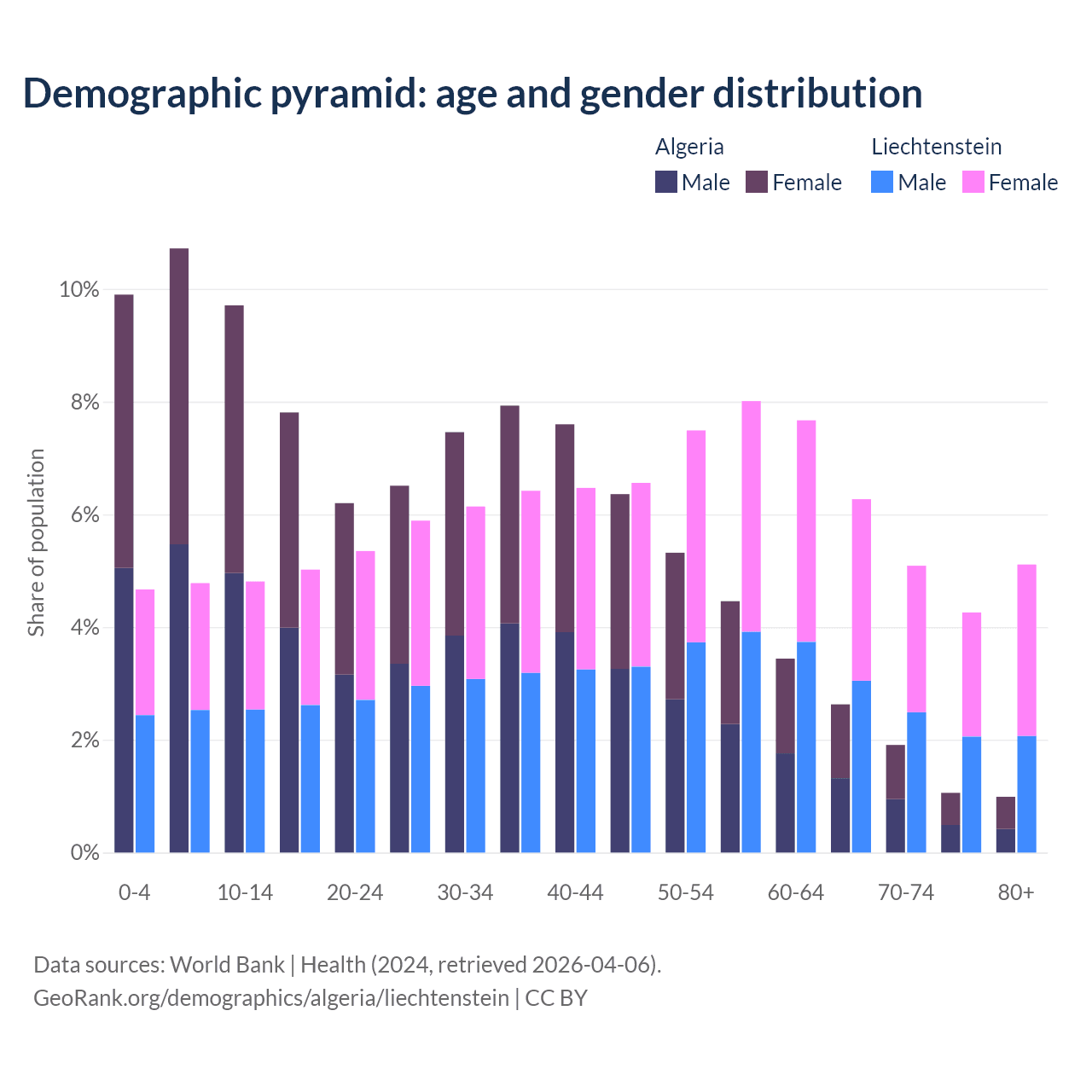 - Algeria is ranked 111/196 by median age (oldest to youngest) vs 13/196 for Liechtenstein.