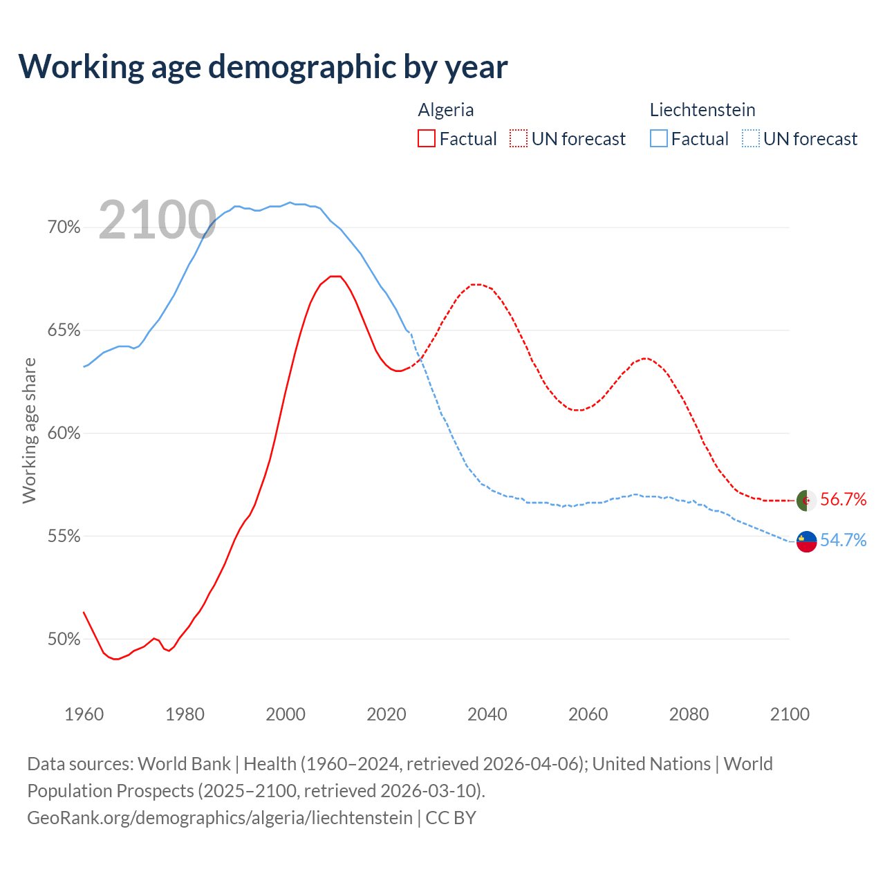 - Algeria has 30.4M working age adults (aged 15-64) vs 26.7K in Liechtenstein.