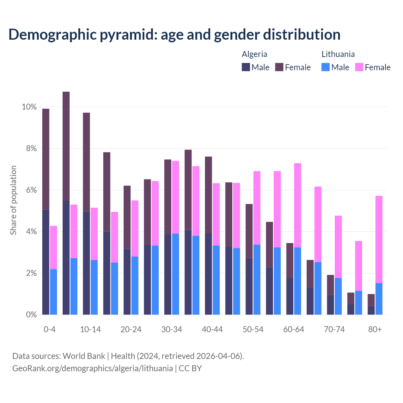 - The share of old-age demographic (65+) in Algeria is 6.58% vs 20.2% in Lithuania.