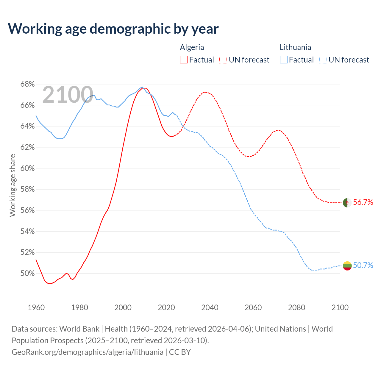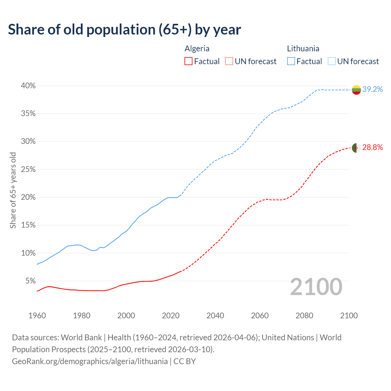 Median age Algeria vs Lithuania, 1960-2100