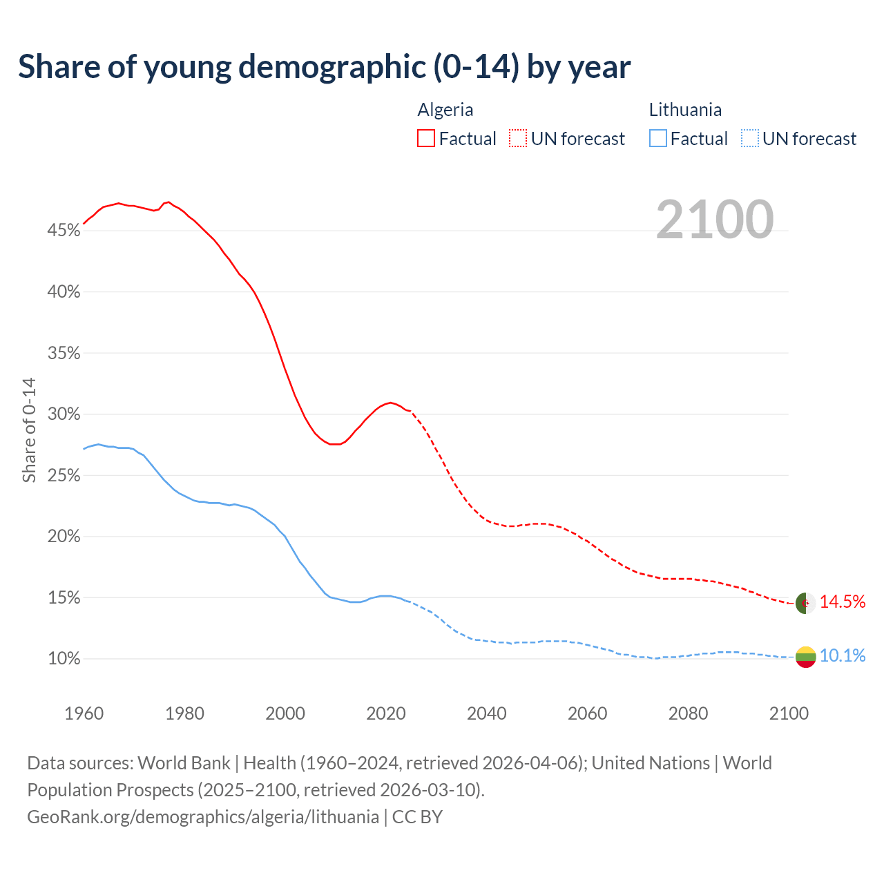 - The share of young demographic (0-15 years old) in Algeria is 30.3% vs 14.7% in Lithuania.