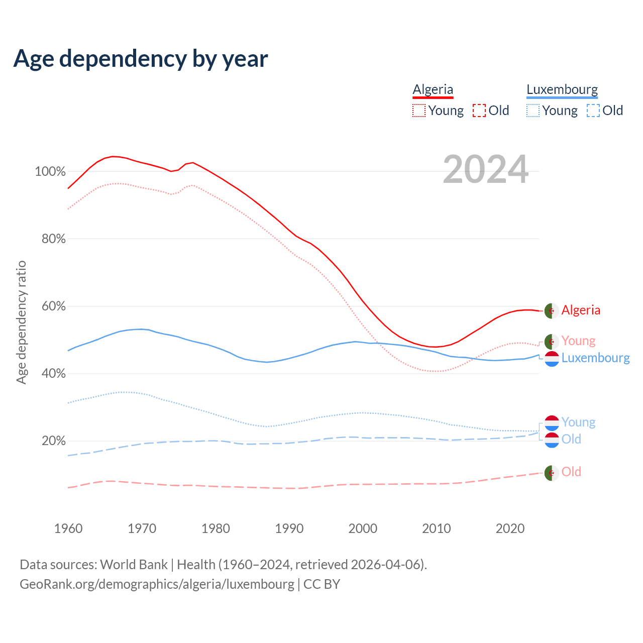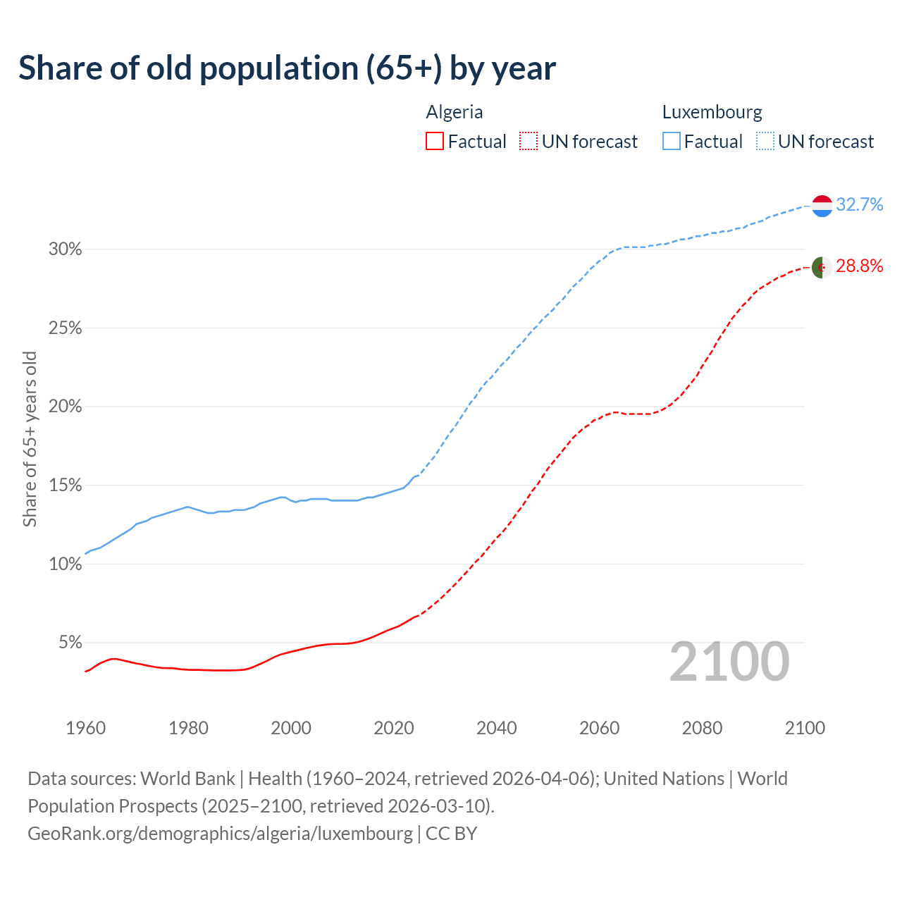 The share of older people aged 65 and over is 6.58% in Algeria and 15.5% in Luxembourg. Life expectancy in Algeria compared to Luxembourg .