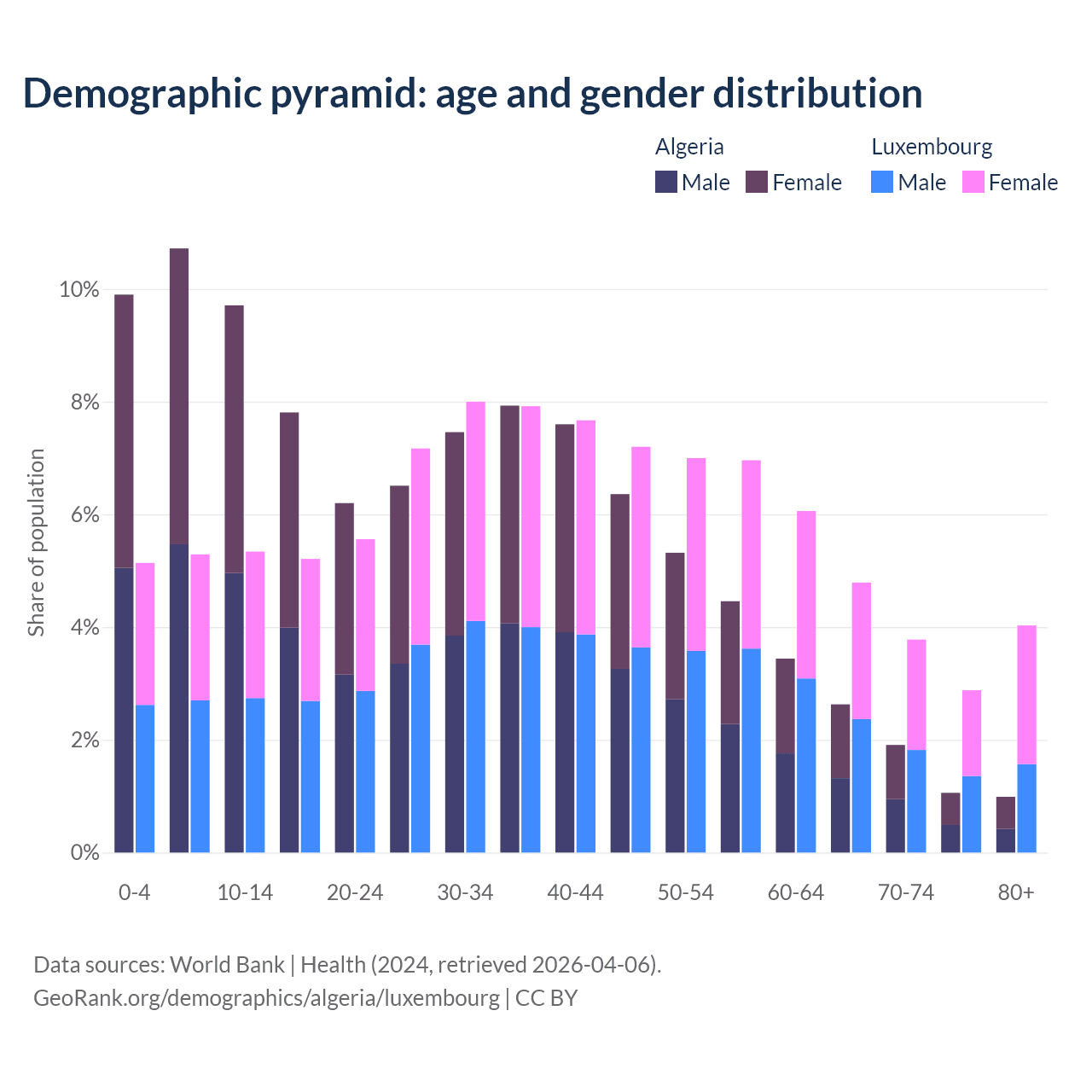 - Algeria is ranked 111/196 by median age (oldest to youngest) vs 46/196 for Luxembourg.