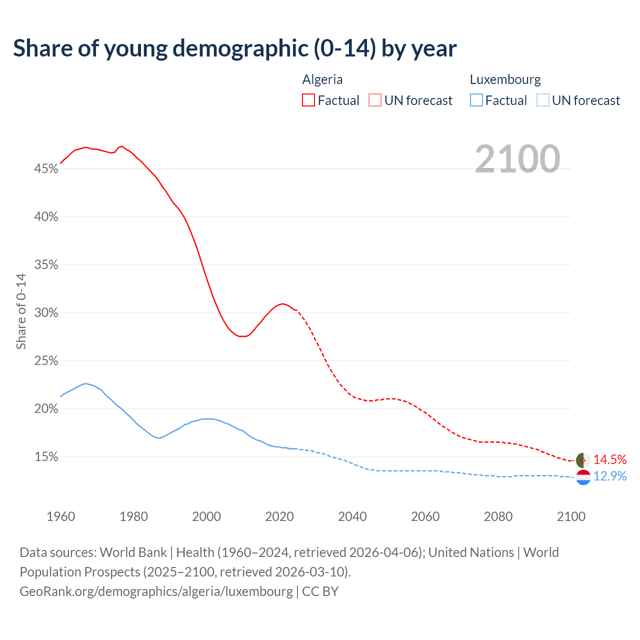 - The share of young demographic (0-15 years old) in Algeria is 30.3% vs 15.8% in Luxembourg.
